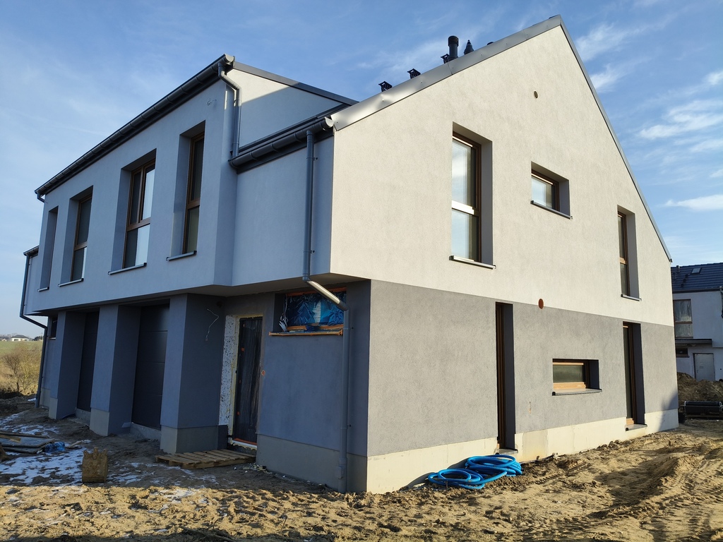 Nowy przestronny budynek w zabudowie bliźniaczej jednopiętrowy o powierzchni całkowitej 137,10 m2, użytkowej 131,42 m2.