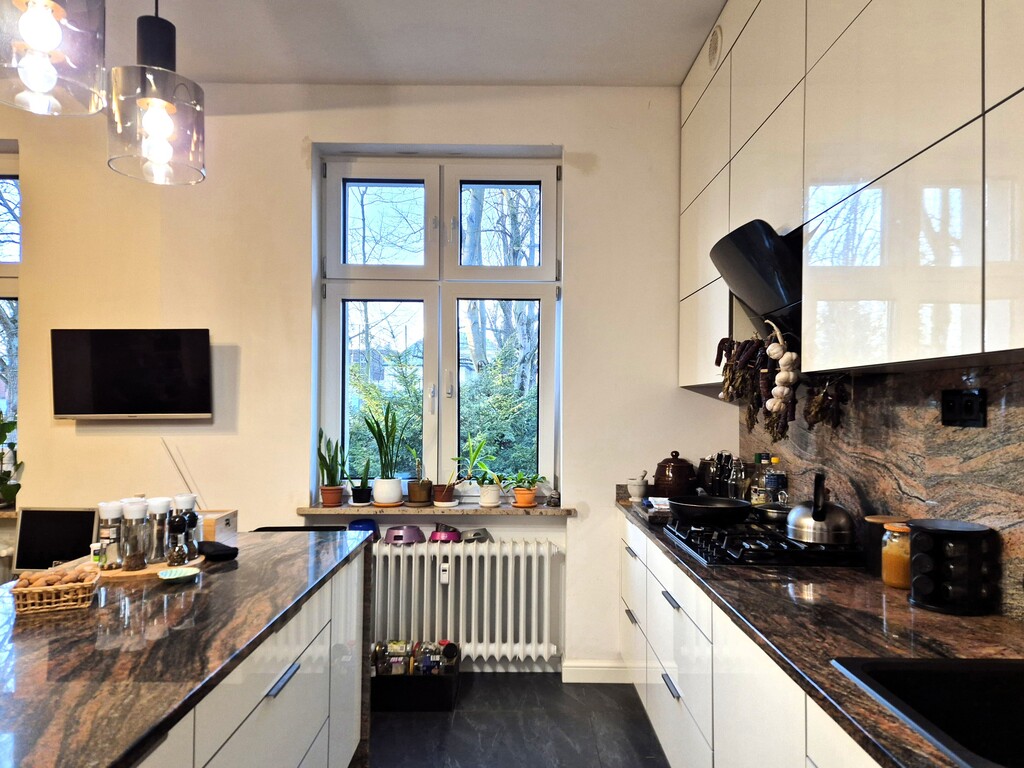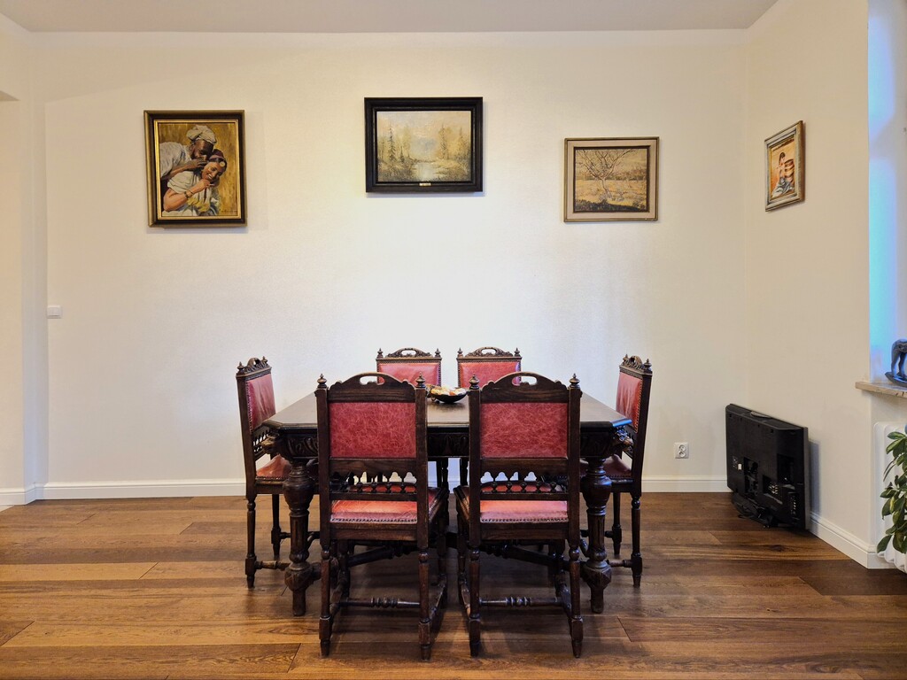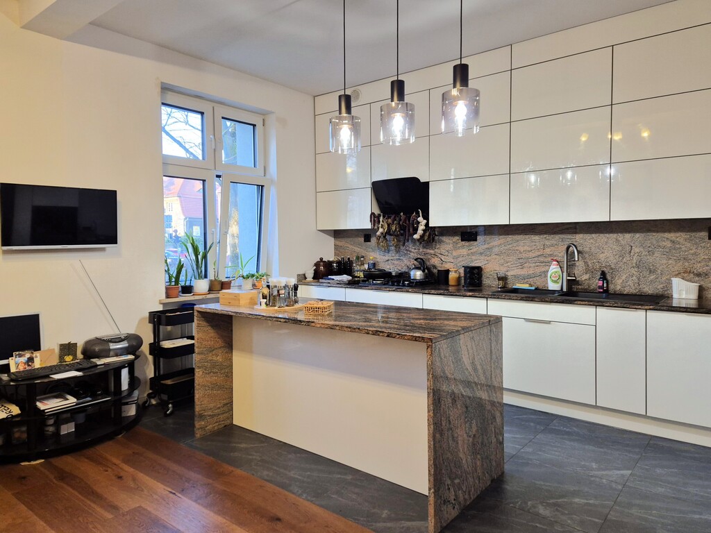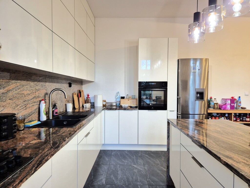 * kuchnia z meblami w zabudowie na wymiar koloru białego z granitowymi blatami i wyspą, wyposażona w sprzęt AGD: piekarnik, lodówkę z zamrażarką, płytę gazową, okap z wyciągiem oraz zmywarkę. Kuchnia to przestronne i jasne pomieszczenie połączone z jadalnią, gdzie obecnie znajduje się duży drewniany stół z 6 krzesłami.