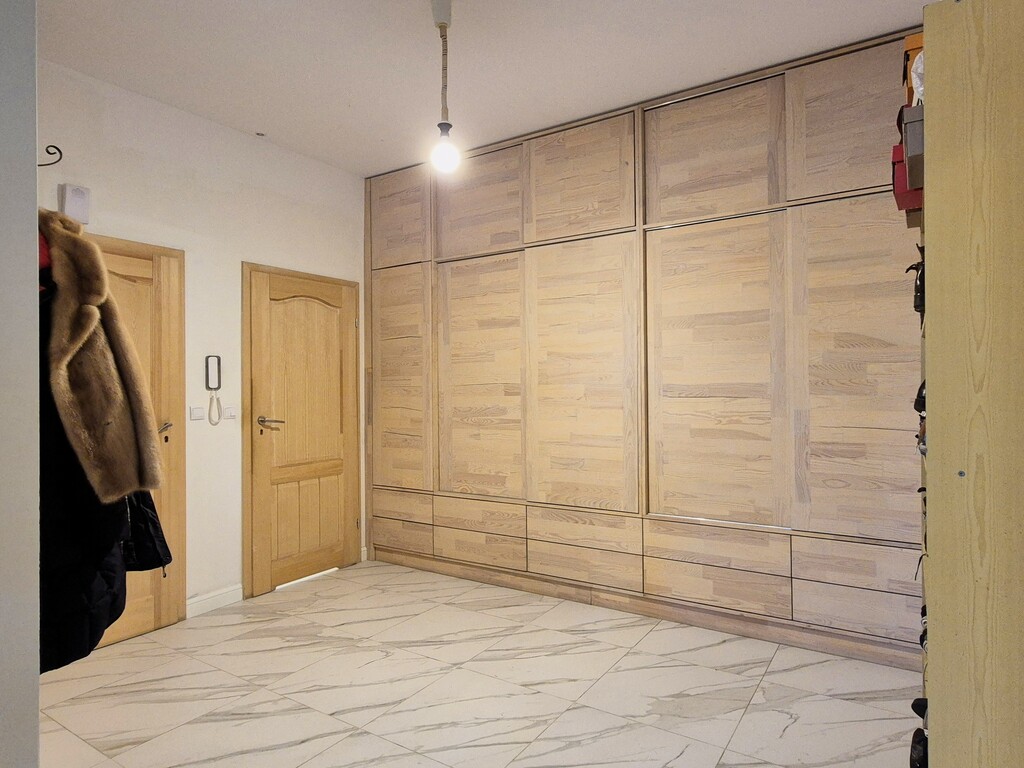* funkcjonalny przedpokój z dużymi, drewnianymi szafami w zabudowie
