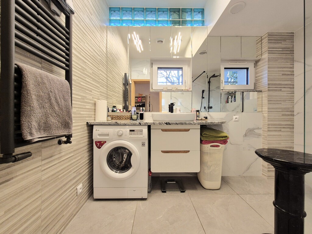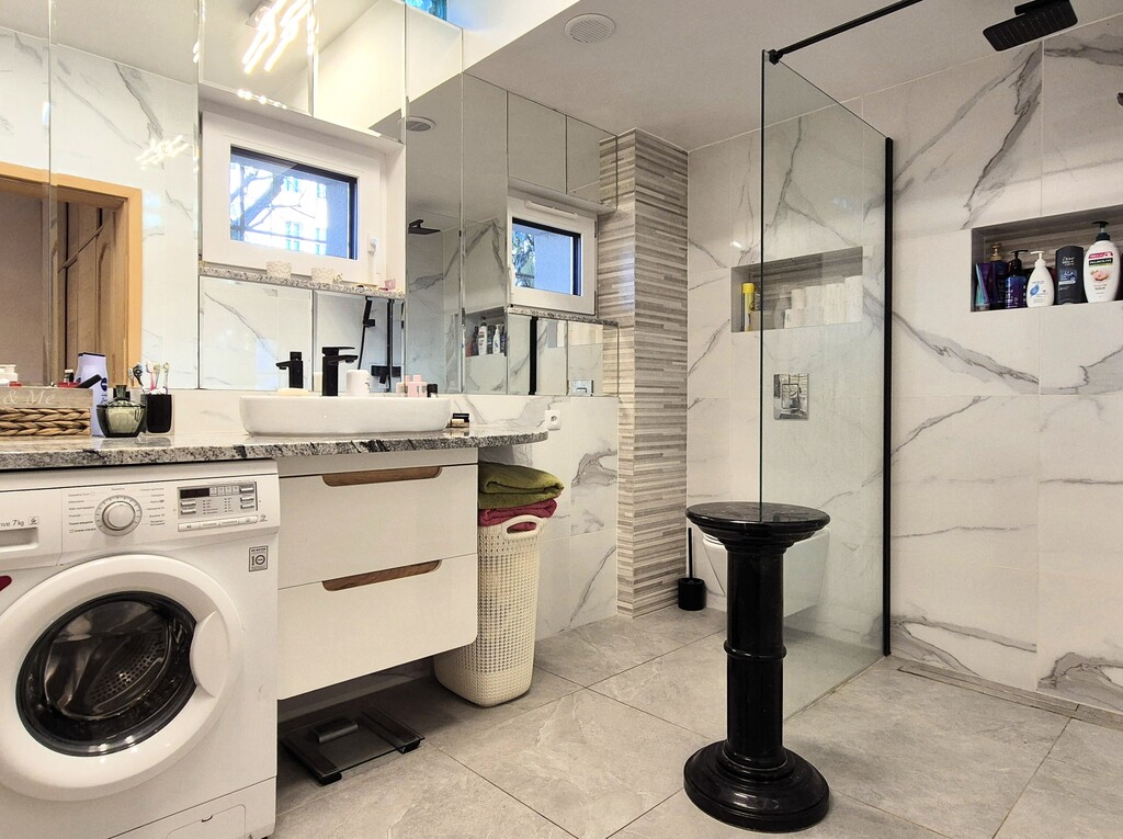* łazienka wykończona materiałami wysokiej klasy – nowe kafle, nowoczesny grzejnik, WC podtynkowe marki Grohe, kabina typu walk-in, pralka. W łazience zainstalowano dodatkowo wentylację mechaniczną.
