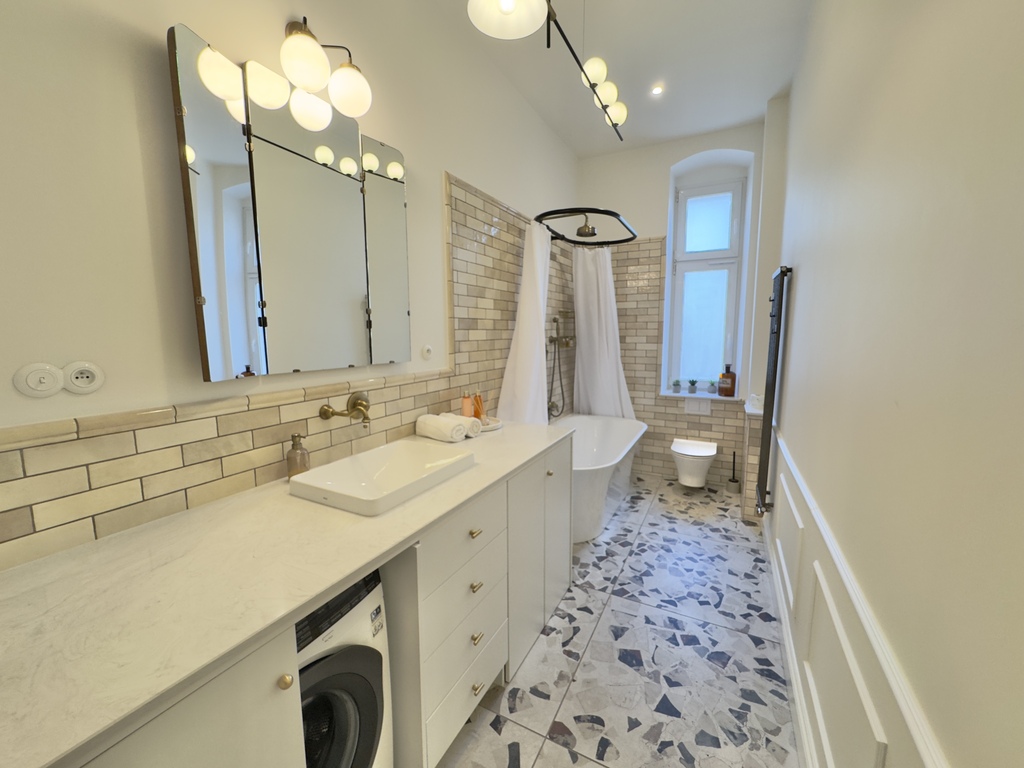 Widna łazienka z wanną, oraz zabudową meblową, w której ukryto pralkę i suszarkę, co świadczy o dbałości o porządek i estetykę. Chowane fronty to innowacyjne rozwiązanie, które pozwala na zachowanie schludnego wyglądu łazienki, eliminując widoczność sprzętów, gdy nie są używane. Instalacja podłogowego ogrzewania elektrycznego w tym pomieszczeniu to kolejny atut, który zapewnia komfort użytkowania, zwłaszcza w chłodniejsze dni. Dodatkowe docieplenie ściany od strony klatki schodowej może przyczynić się do poprawy efektywności energetycznej całego pomieszczenia, a także wpłynąć na jego komfort termiczny.