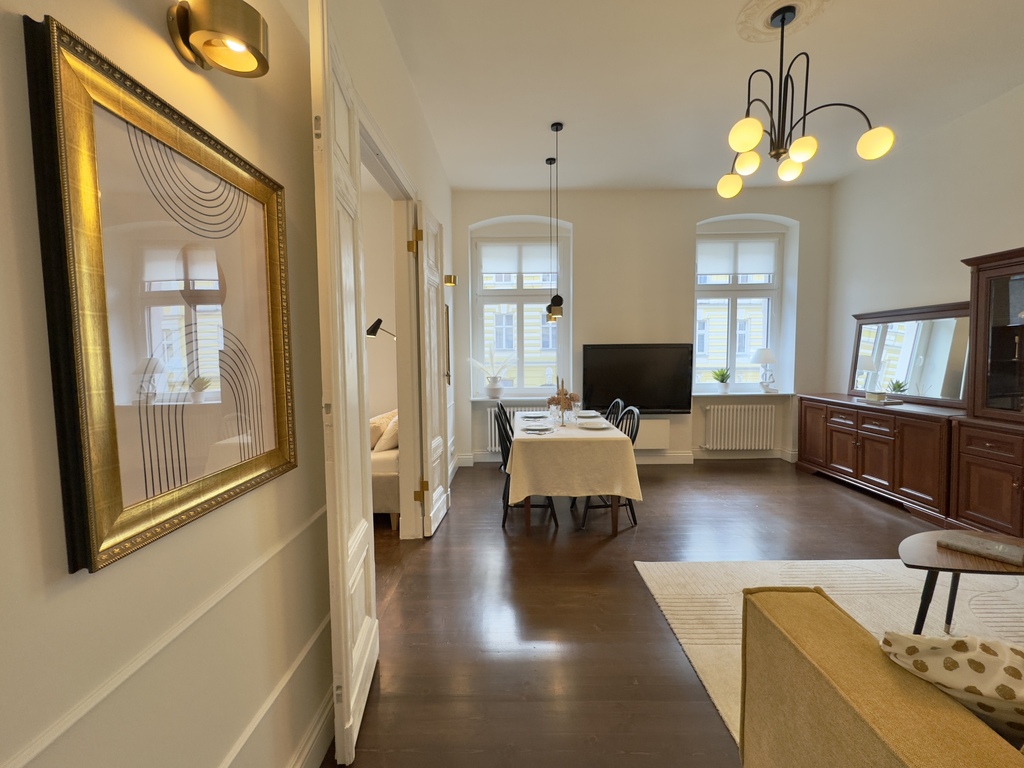 Mieszkanie składa się z trzech przestronnych pokoi, kuchni, łazienki oraz przedpokoju. Wszystkie pomieszczenia są w pełni rozkładowe, co zapewnia komfort użytkowania. Z przedpokoju prowadzą osobne wejścia do każdego z pokoi, a także do pozostałych części mieszkania. Warto zwrócić uwagę na zachowane piękne, oryginalne drzwi dwuskrzydłowe między dwoma pokojami, które dodają uroku całej przestrzeni.
