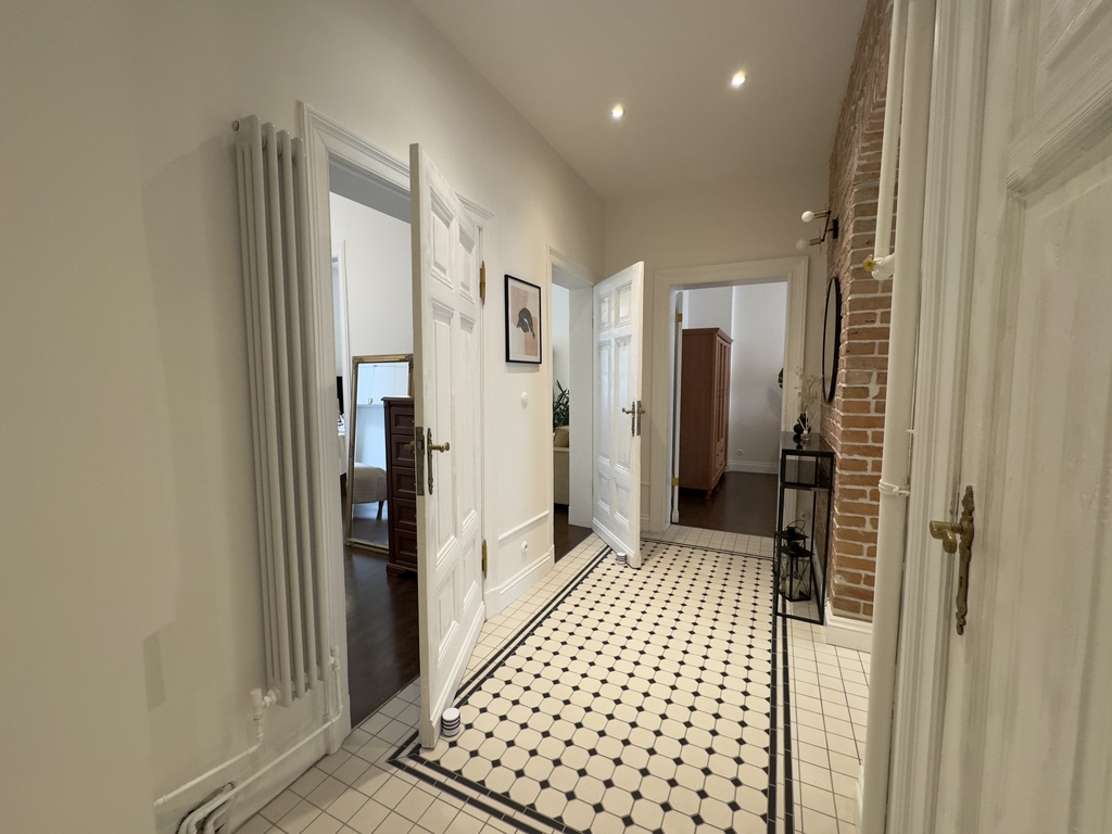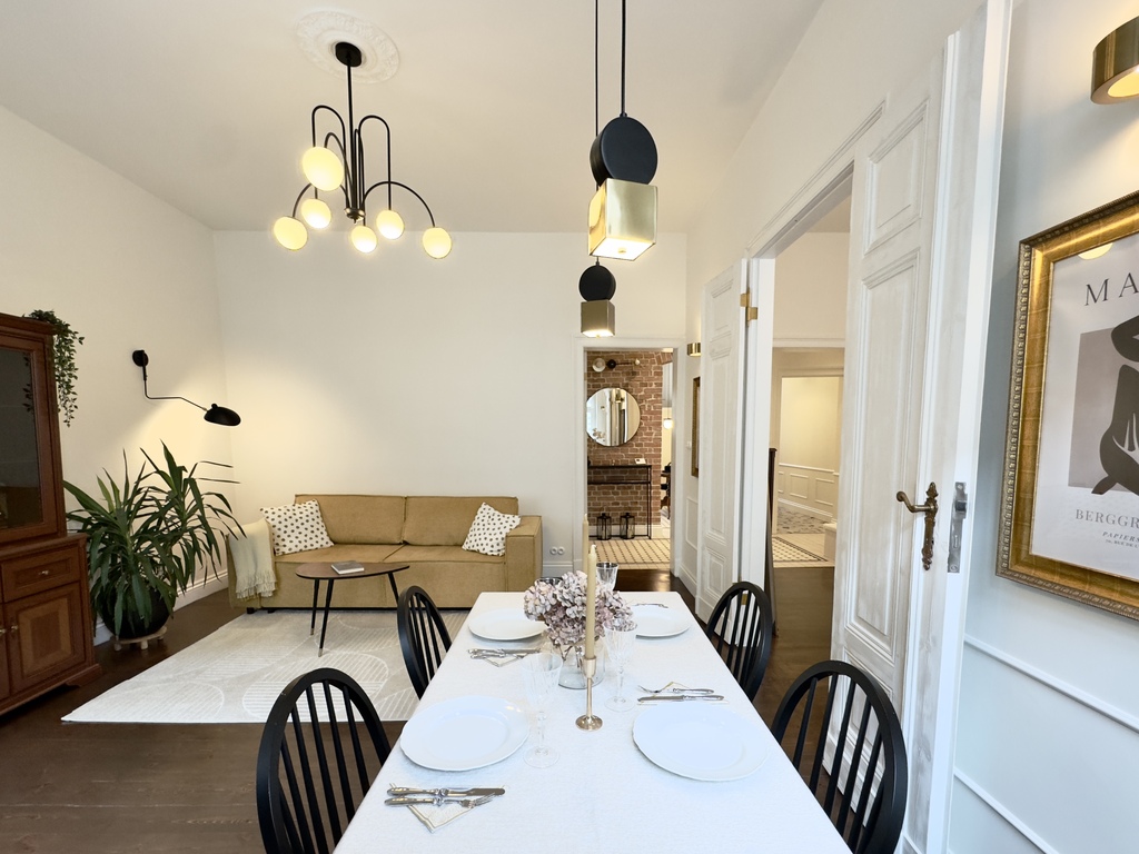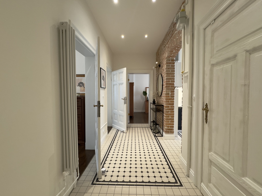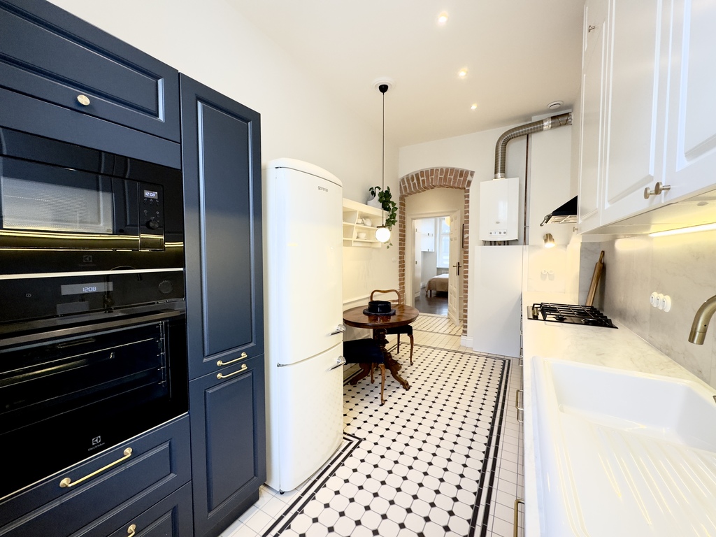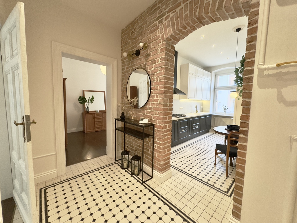 Całość została zaprojektowana z dbałością o najdrobniejsze detale, wykorzystując materiały najwyższej jakości. Mieszkanie przeszło staranny remont, który był inspirowany potrzebami właścicieli lokalu- miłośników kamienic. W korytarzu oraz kuchni odkryto oryginalną ceglaną ścianę, skrywającą pod tynkiem łukowe nadproże, które dodaje przestrzeni. Ściany zdobi ozdobna sztukateria, a progi zostały zlikwidowane, co sprawia, że przestrzeń jest bardziej spójna i komfortowa, oraz wpływa na estetykę i funkcjonalność wnętrza.
