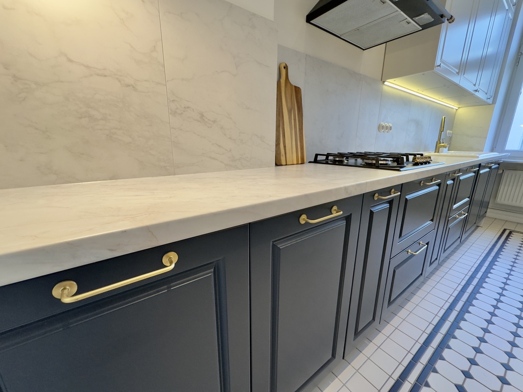 Elegancka kuchnia w pełni wyposażona we wszystkie niezbędne sprzęty AGD. Lakierowana zabudowa meblowa wykończona mosiężnymi uchwytami.