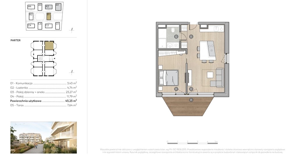 Prezentowana oferta dotyczy apartamentu, o powierzchni 43,23 m2, który składa się z: