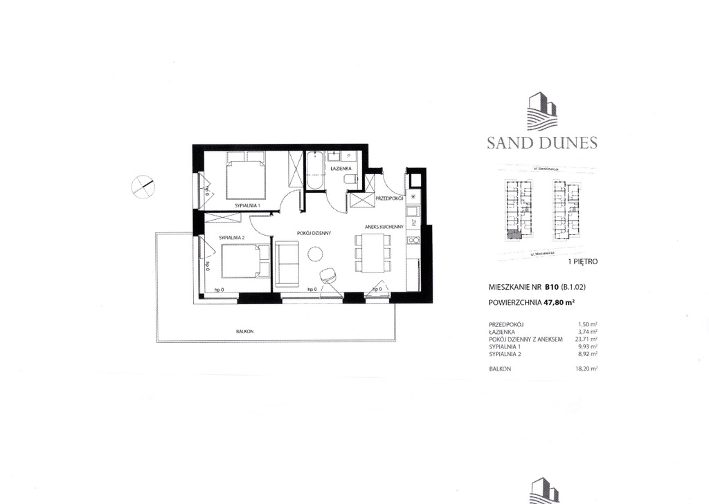 Apartament 3 - pokojowy o powierzchni 47,8 m2 od strony Zatoki Wrzosowskiej z oknami na południowy wschód w budynku położonym nad morzem w pierwszej linii od plaży. Pokój dzienny z aneksem kuchennym 23,71 m2, sypialnia 9,93 m2 oraz 8,92 m2. Przedpokój 1,5 m2. Łazienka 3,74 m2 z miejscem na wannę lub prysznic, pralkę i umywalkę WC razem. Balkon 18,2 m2, wejście na balkon z aneksu kuchennego, pokoju dziennego oraz mniejszej sypialni. I piętro. Sand Dunes w Dziwnowie to kameralna inwestycja obejmująca dwa budynki o wyjątkowej architekturze położone w idealnej lokalizacji, w pierwszej linii zabudowy, z widokiem na Morze Bałtyckie z jednej strony oraz rzekę Dziwną i Zatokę Wrzosowską z drugiej. Inwestycja oddalona jest od morza jedynie o 60 m, a zejście na plażę bezpośrednio z terenu inwestycji spełni oczekiwania najbardziej wymagających Klientów. Możliwość wykończenia na życzenie klientów i zarządzanie najmem. W garażu podziemnym stacje do ładowania samochodów elektrycznych. Zjazd do garażu windą. Miejsce postojowe w garażu podziemnym w cenie 80.000 zł.