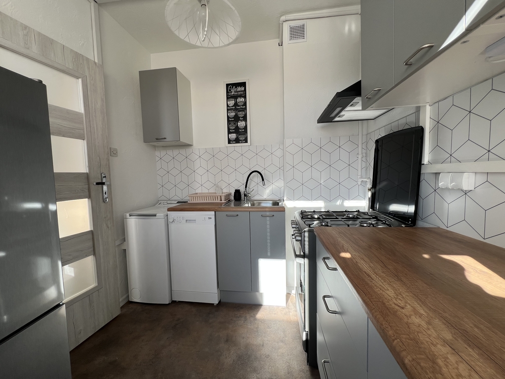 Kuchnia z meblami w zabudowie oraz ze sprzętem - kuchenka, lodówka, zmywarka, pralka.