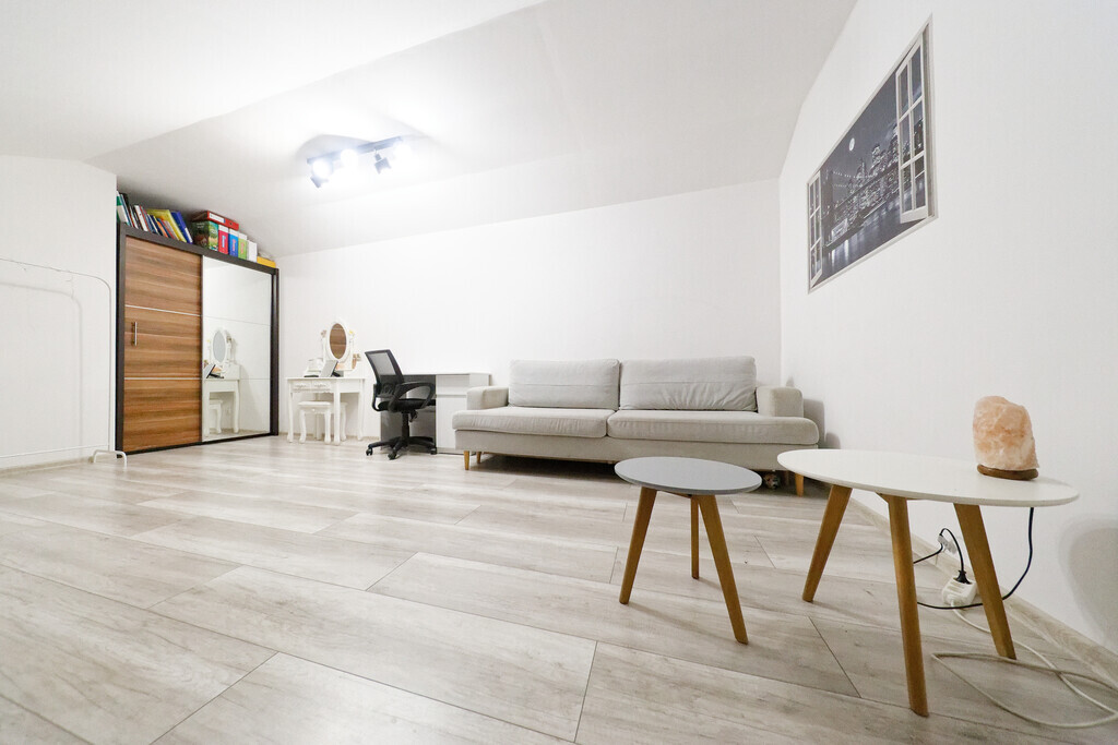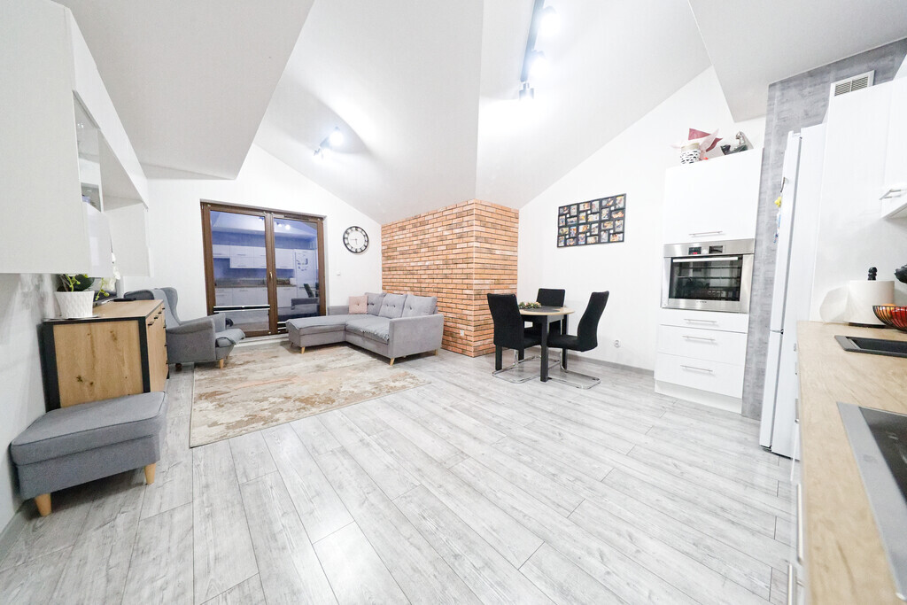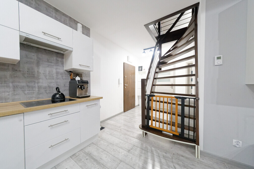 Mieszkanie jest dwupoziomowe i składa się z 4 pokoi, łazienki, przedpokoju oraz balkonu dostępnego ze strefy dziennej. Górny poziom to poddasze użytkowe którego powierzchnia użytkowa wynosi 17,4 m2 (powierzchnia wyznaczona według obowiązującej normy PN-ISO 9836:1997). Razem z powierzchnią pomocniczą powierzchnia poddasza wynosi ok 30 m2. Powierzchnia użytkowa dolnego poziomu wynosi 56,13 m2. Powierzchnia użytkowa całego mieszkania to 73,43 m2. Powierzchnia opisana w księdze wieczystej uwzględnia sam dolny poziom dzięki czemu poddasze nie jest wliczane w czynsz administracyjny co przekłada się na jego niski koszt (ok 420zł).