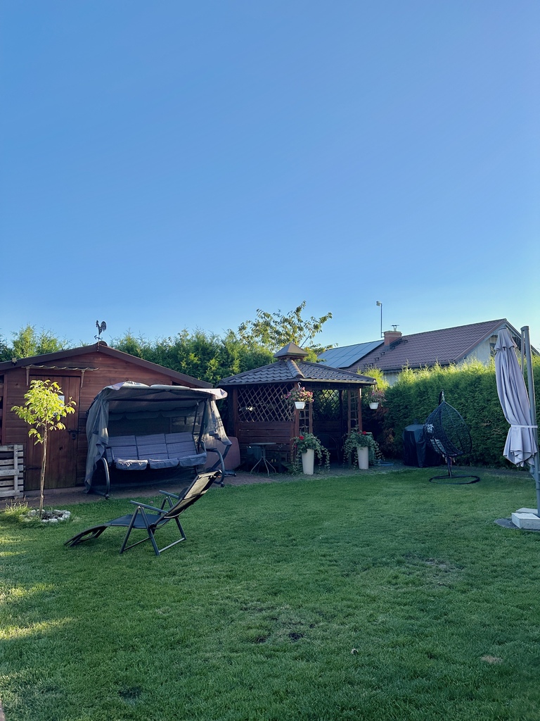 Dom otoczony jest dużym ogrodem z posadowionymi tujami i drzewkami owocowymi, który zapewnia prywatność i możliwość relaksu na świeżym powietrzu. Działka o powierzchni 1186 metrów kwadratowych daje wiele możliwości zagospodarowania, w tym miejsce na plac zabaw dla dzieci, ogród warzywny lub przestrzeń rekreacyjną.