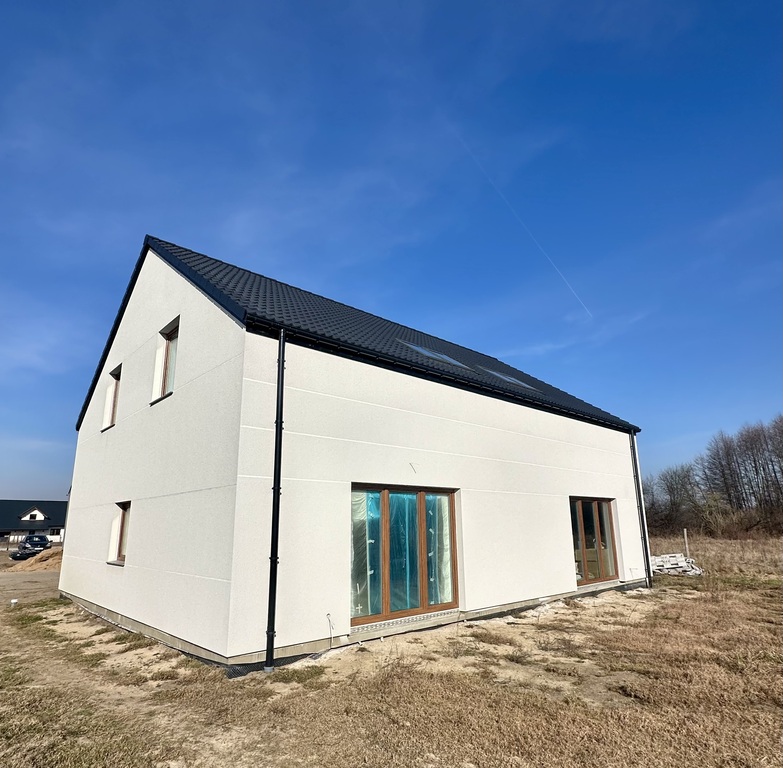 Elewacja wysokiej jakości w jasnych kolorach, podejście do domu z polbruku, odprowadzenie wody deszczowej.