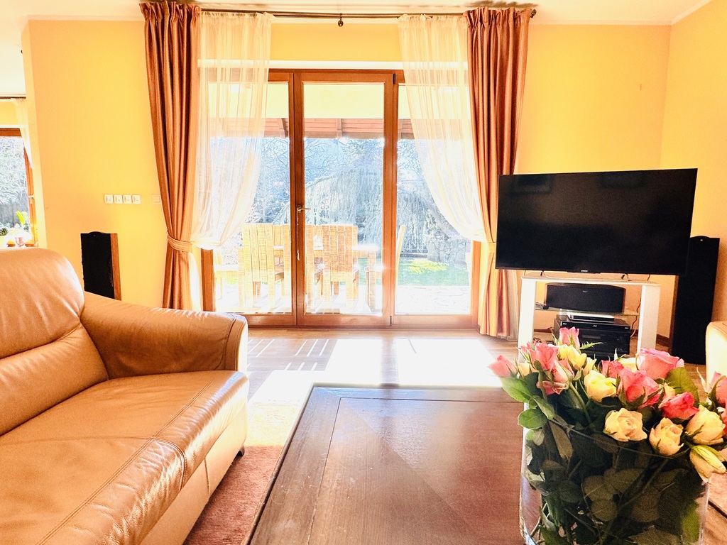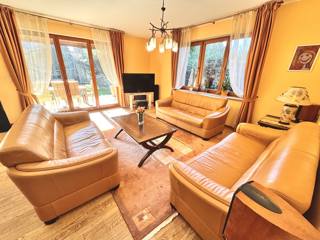 pokój dzienny (z wyjściem na zadaszony taras i ogród), jadalnia, kuchnia, spiżarnia, dwie łazienki (jedna z prysznicem, druga z wanną), oraz 3 sypialnie dla miłośników dobrego snu.