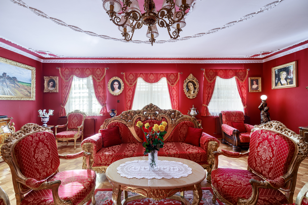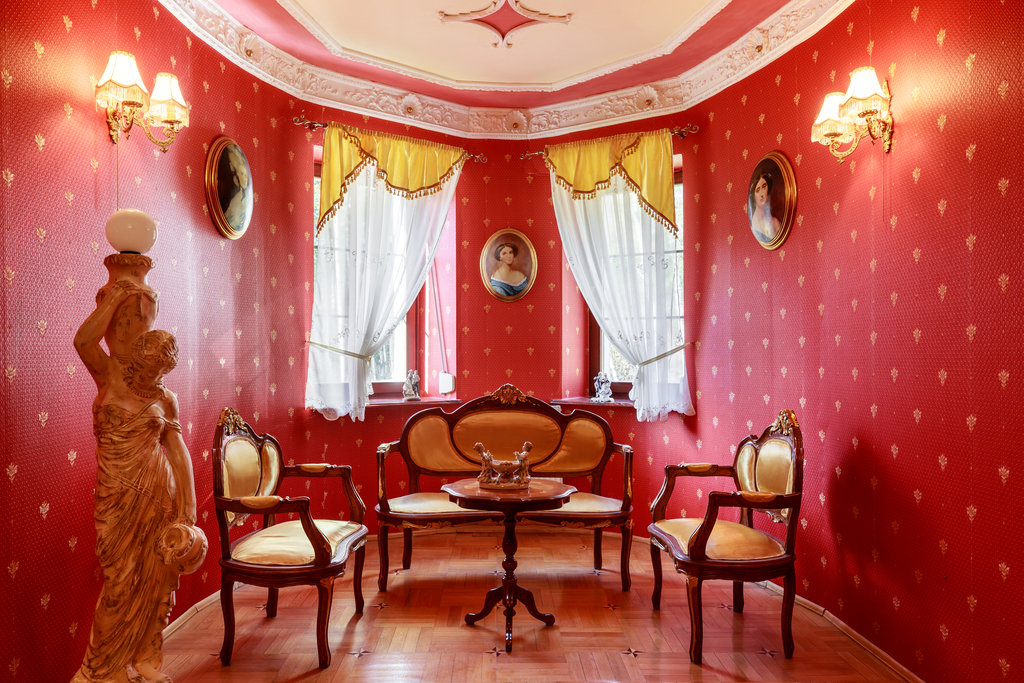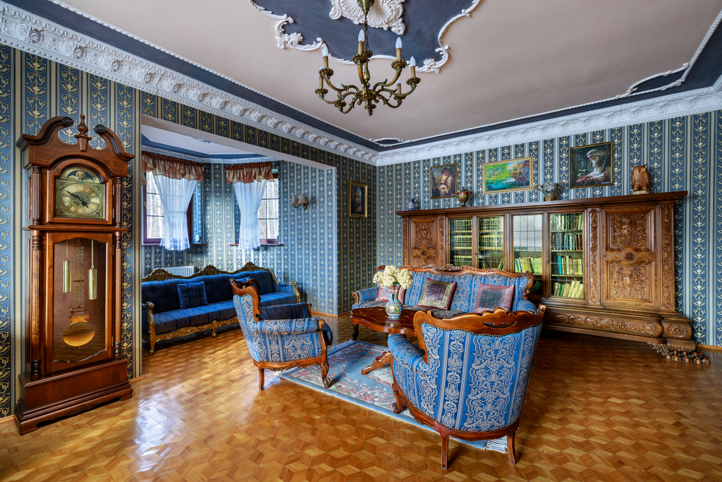 Wnętrza urzekają eleganckim stylem wiktoriańskim – mahoniowe meble, złocone lustra, stylowe tapety oraz drewniane parkiety w geometryczne wzory tworzą unikalny klimat.