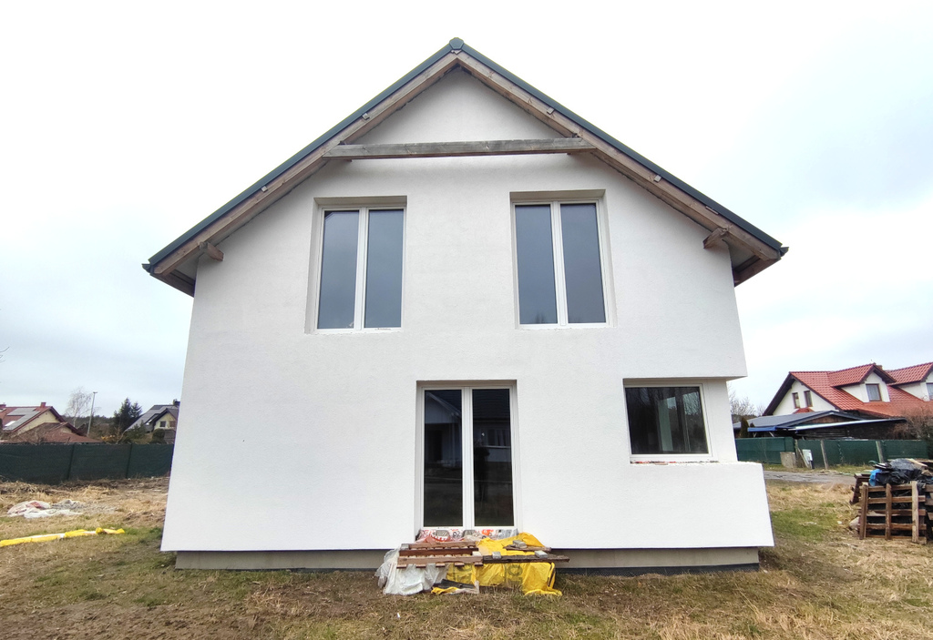 W domu zamontowane są okna pcv trzyszybowe, drzwi wejściowe z szybą "wenecką".