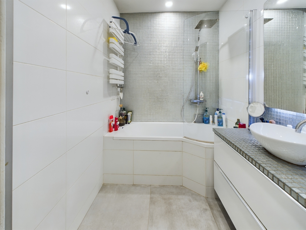 Przestronna, wykończona mozaikowymi płytkami, które nadają wnętrzu nowoczesnego charakteru. Znajduje się tu wanna z funkcją prysznica (parawan), praktyczna szafka z umywalką nablatową oraz duże lustro optycznie powiększające przestrzeń. Dzięki temu pomieszczenie jest jednocześnie funkcjonalne i estetyczne.