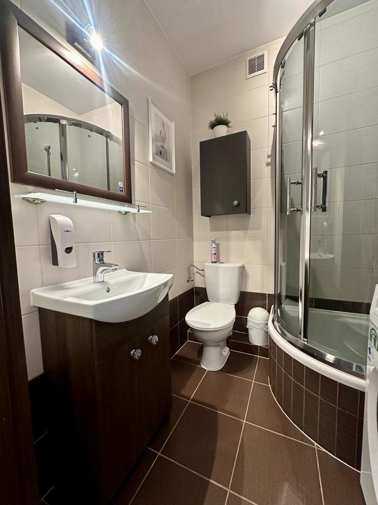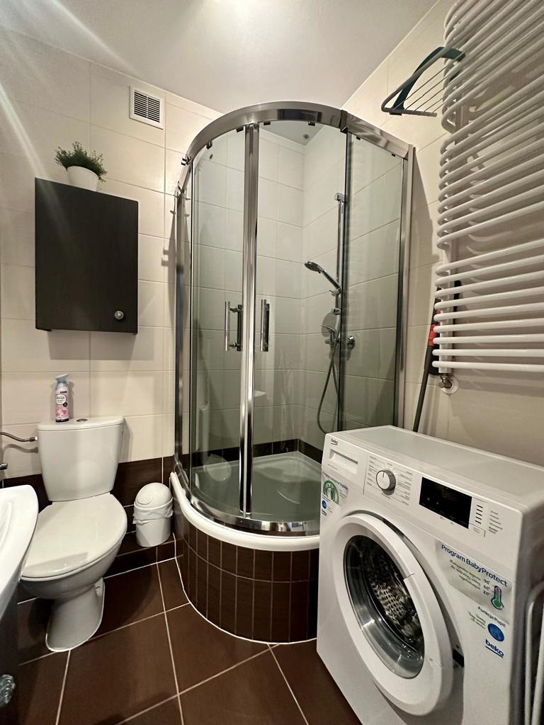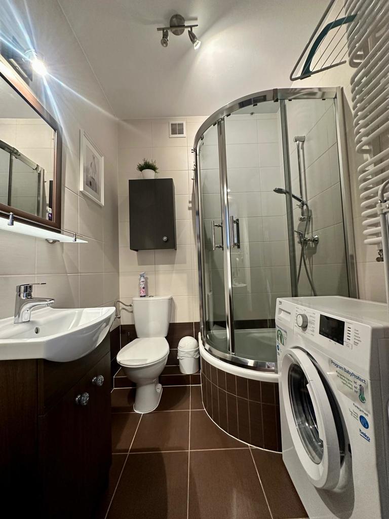 * łazienka wyposażona w prysznic oraz pralkę,