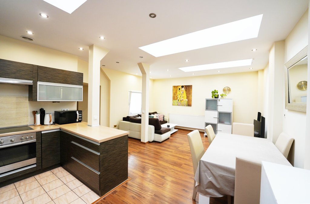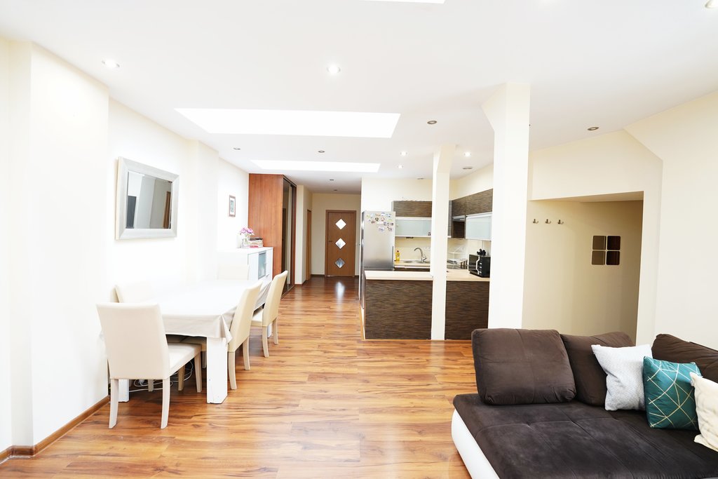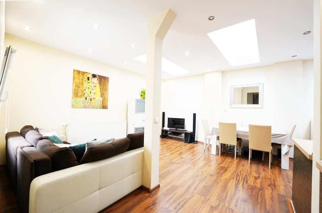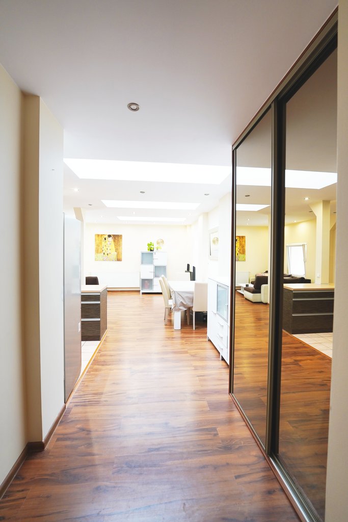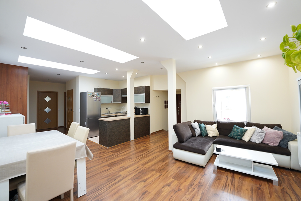 Mieszkanie jest bardzo dobrze dobrze doświetlone - duże okna PCV w pokojach oraz dodatkowe okna połaciowe w salonie rozświetlają
