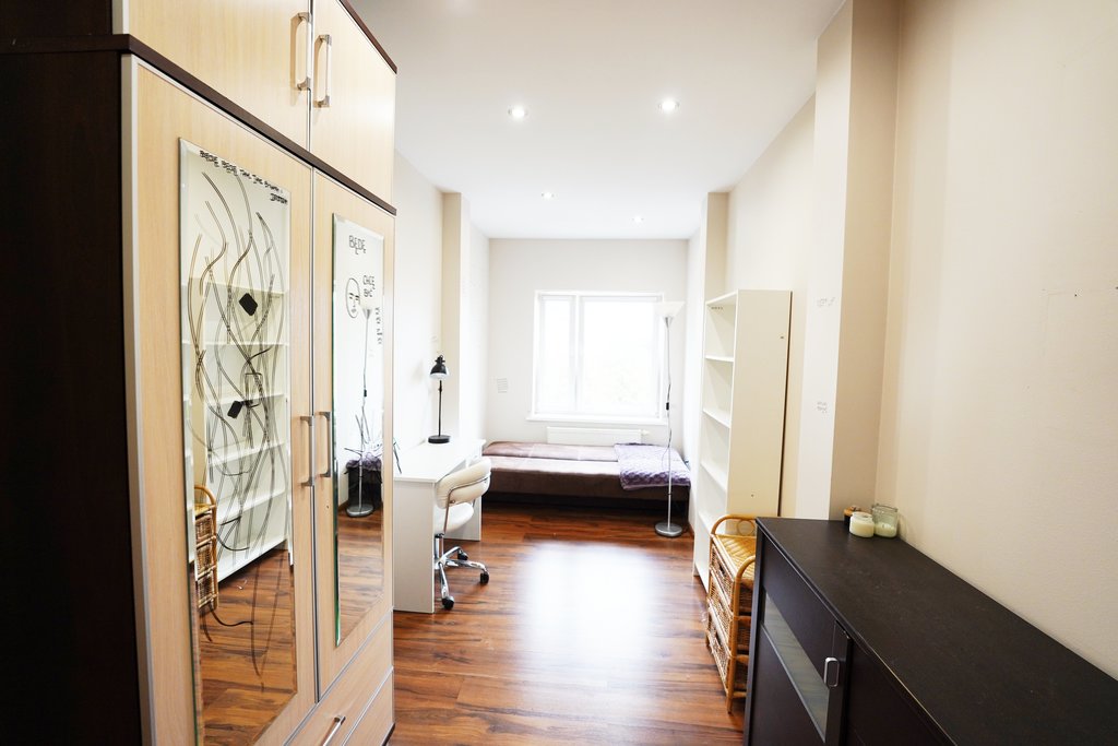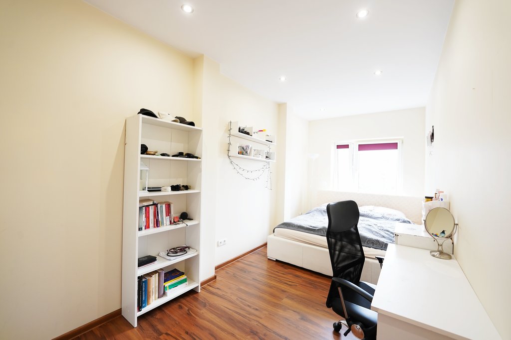 Ściany malowane w stonowanym kolorze, na podłogach położone panele.