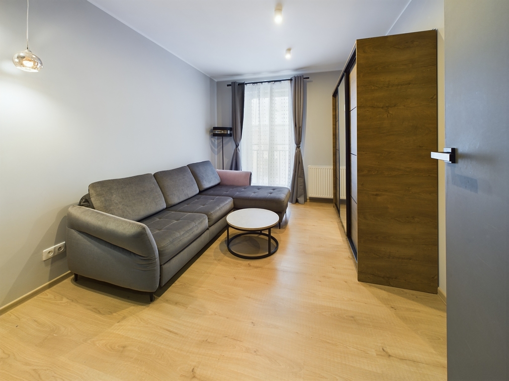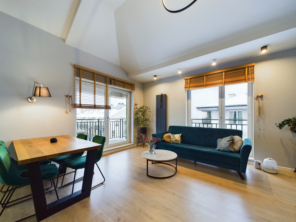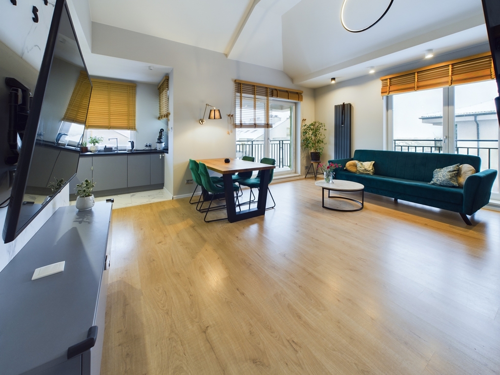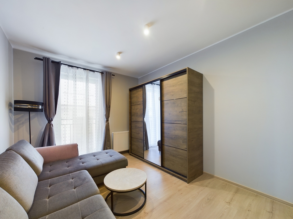- Przestronny salon z aneksem kuchennym oraz wyjściem na balkon,