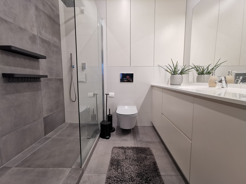 ŁAZIENKA: umywalka, prysznic, pralka, grzejnik drabinkowy oraz szafki np. na środki czystości.