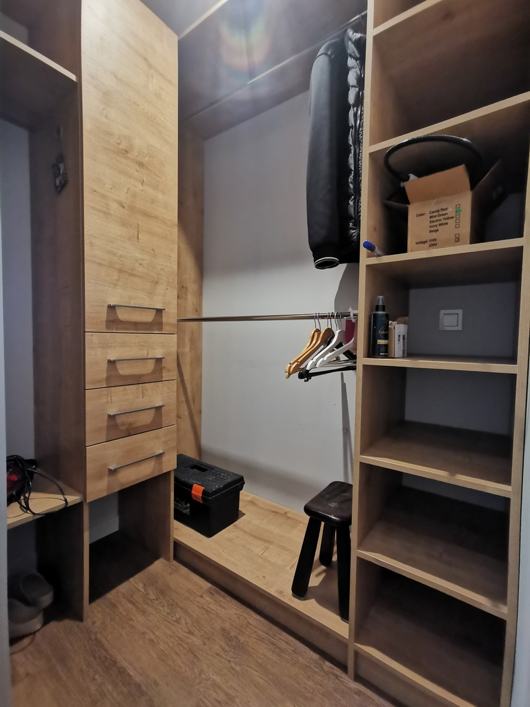 SYPIALNIA: Duża szafa, biurko, suszarka na pranie.