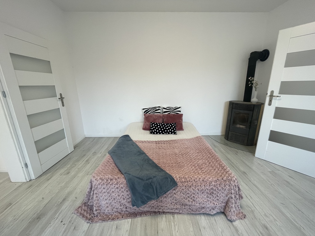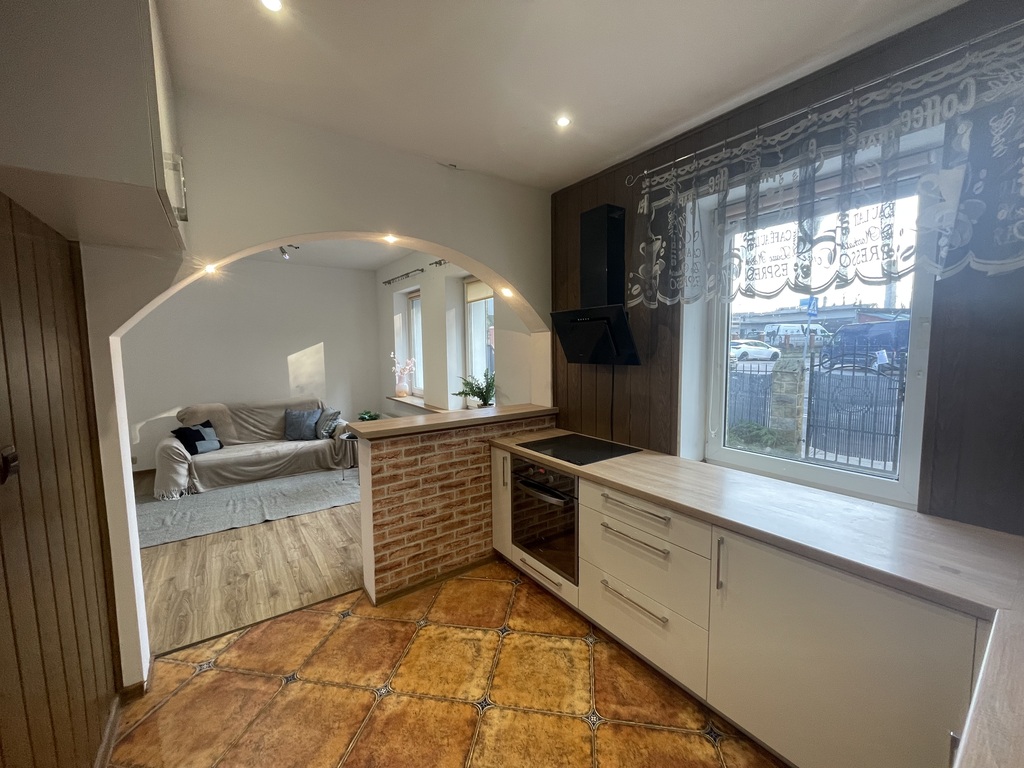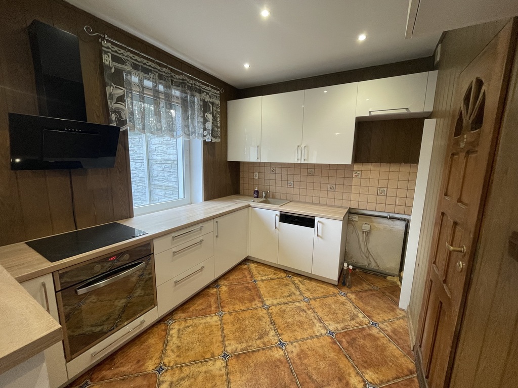 Kuchnia z meblami w zabudowie, płyta grzewcza elektryczna, nie ma lodówki. Ogrzewanie gazowe, ciepła woda z pieca gazowego.