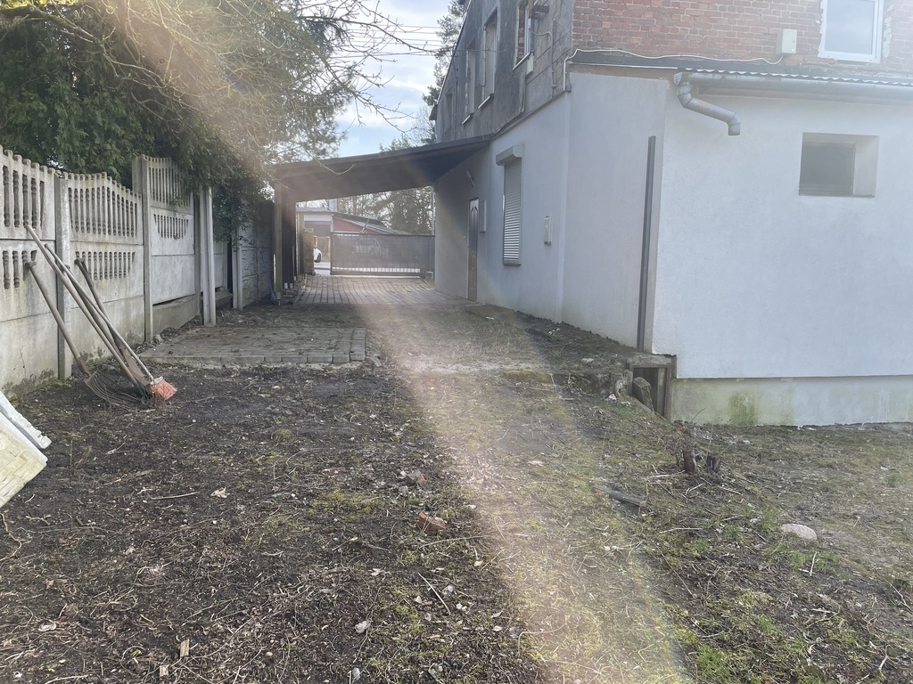 Okna PCV, rolety zewnętrzne sterowane elektrycznie, brama wjazdowa, własny podjazd z wiatą, ogród, na ogrodzie domek gospodarczy murowany.