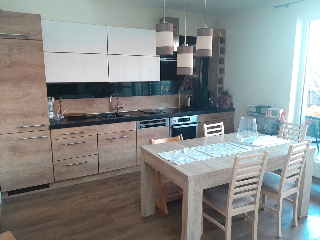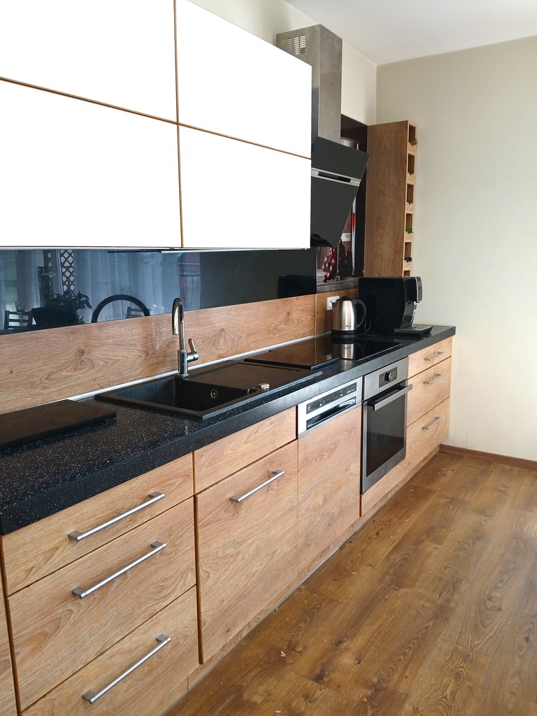 Kuchnia wyposażona w zmywarkę, lodówkę okap, piekarnik i kuchenkę indukcyjną.