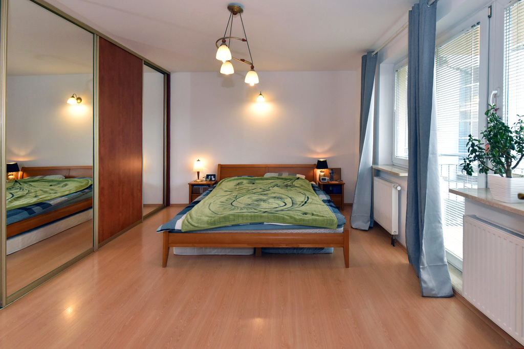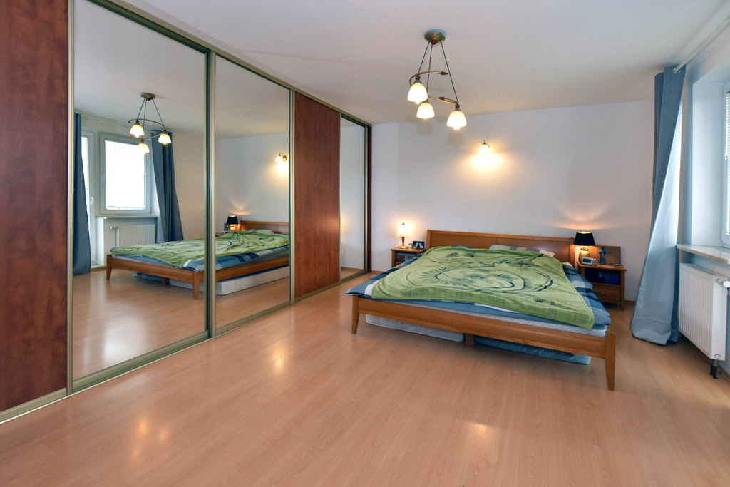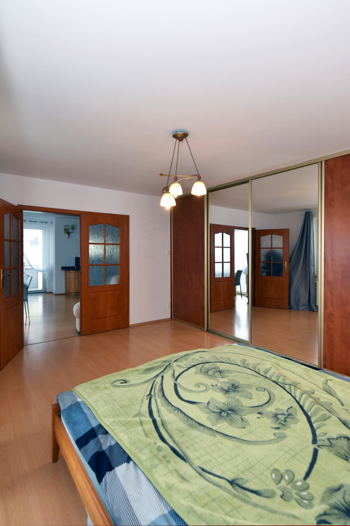 - sypialnia 1 z balkonem i garderobą 25m2, zabudowa stała w postaci dużej szafy na całej długości ściany i dodatkowym pomieszczeniem garderoby. Widok z sypialni na ogrody, cichy i ciepły pokój.