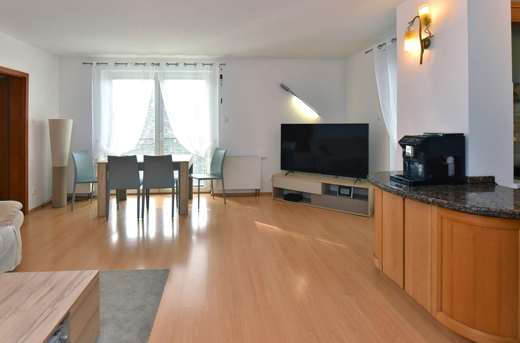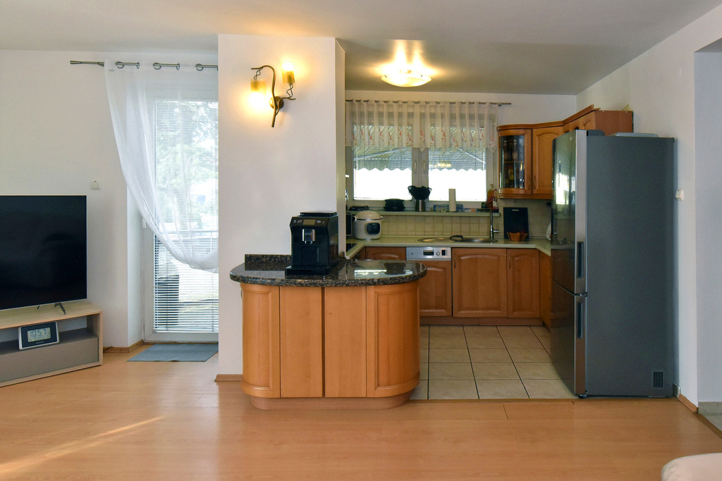 - przestronny salon z otwartą kuchnią 37m2, z wyjściem na taras. Duże okna doskonale doświetlają wnętrze, dzięki czemu panuje tu przytulna, ale i pełna energii atmosfera. Kuchnia z oknem, w pełni wyposażona w nowy sprzęt AGD (piekarnik, płyta elektryczna, lodówka, zmywarka),