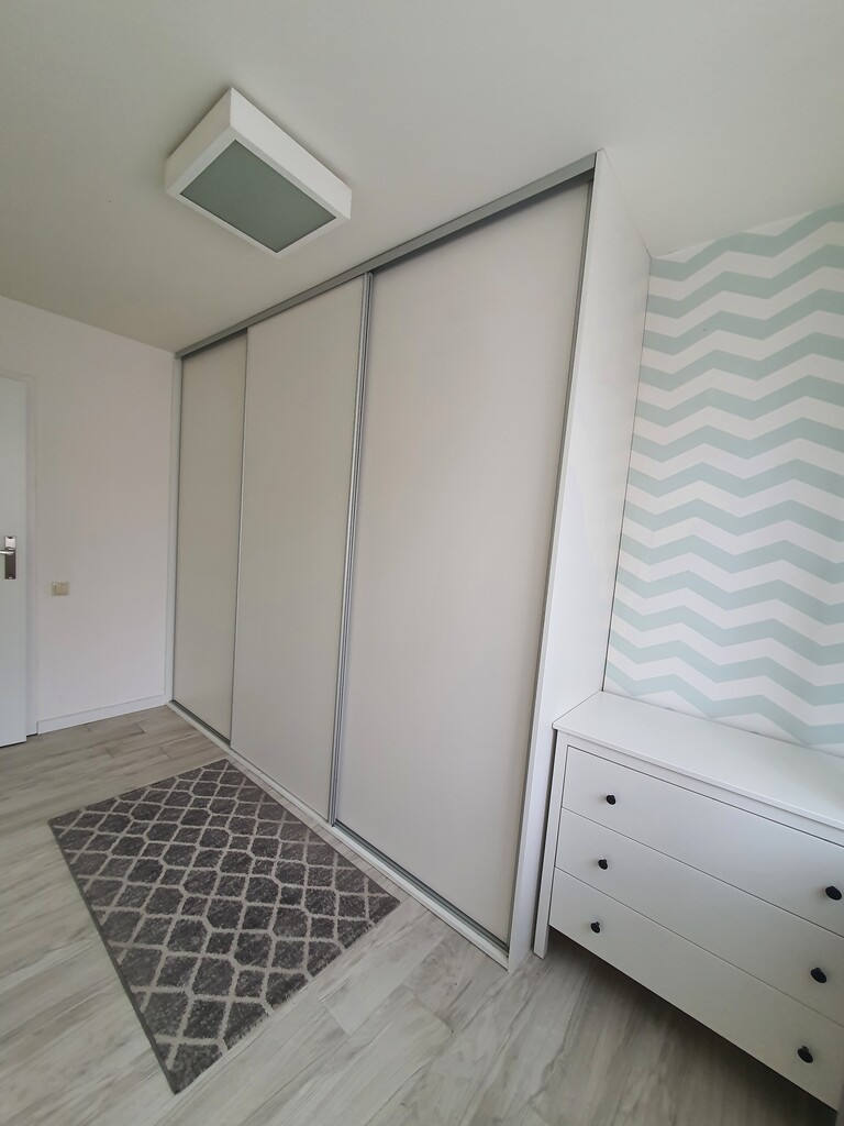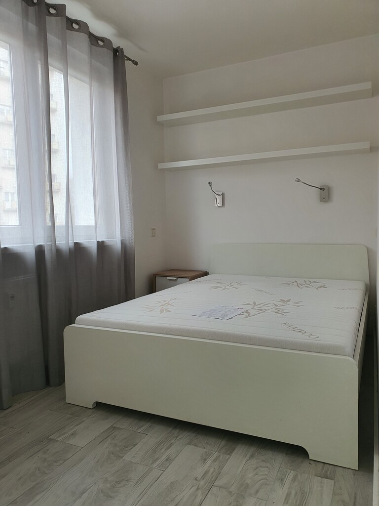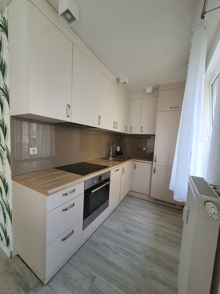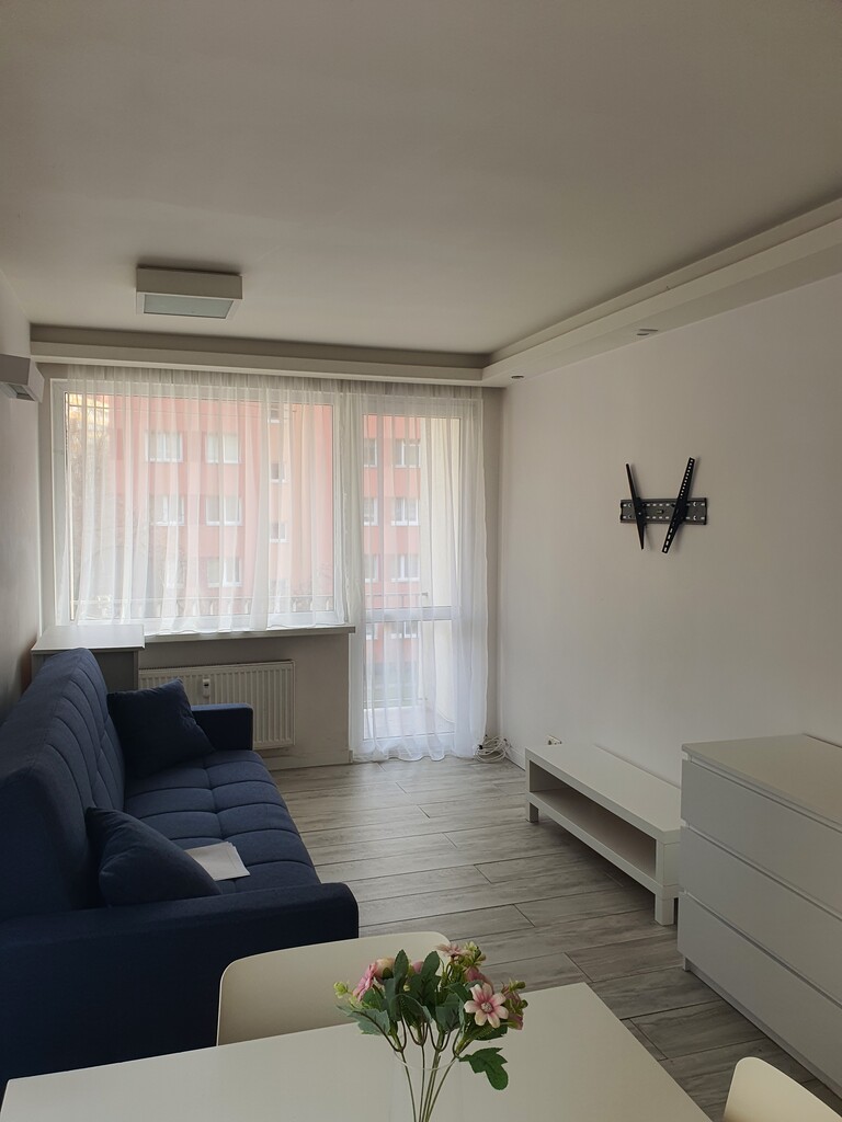 Wynajmowane mieszkanie z wyposażeniem meblowym, tj. łóżko 140x200cm z nowym materacem, szafka nocna, duża zabudowana szafa, służąca jako garderoba, komoda z 3 szufladami, rozkładana kanapa 3-osobowa, szafka rtv, komoda z 6 szufladami oraz stół z krzesłami. Łazienka w pełni uposażona z pralką. Aneks kuchenny wyposażony w sprzęty, tj. lodówka z zamrażarką, zmywarka, płyta, okap i piekarnik. Wszystkie sprzęty działają bez zarzutu.