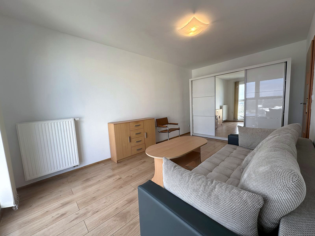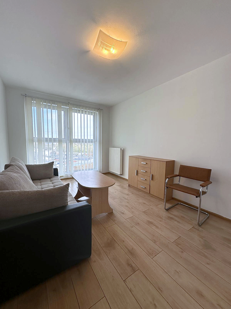 - przestronny salon wyposażony w duże okno z którego rozpościera się widok na panoramę miasta;