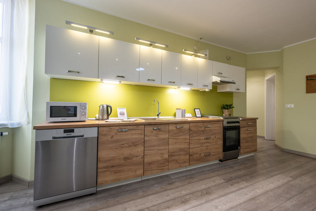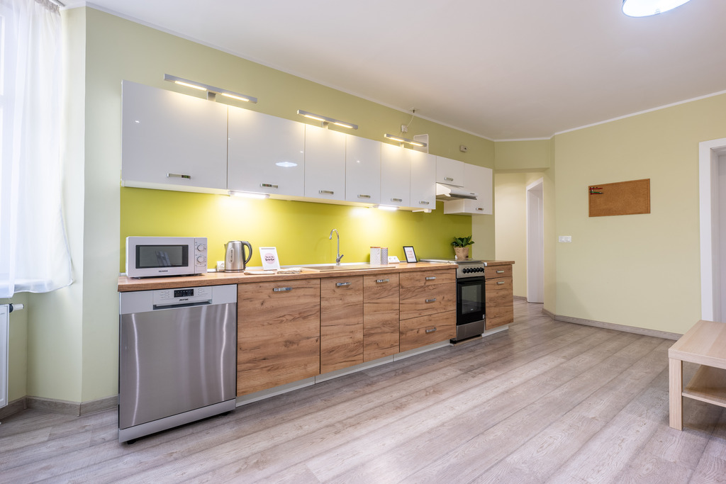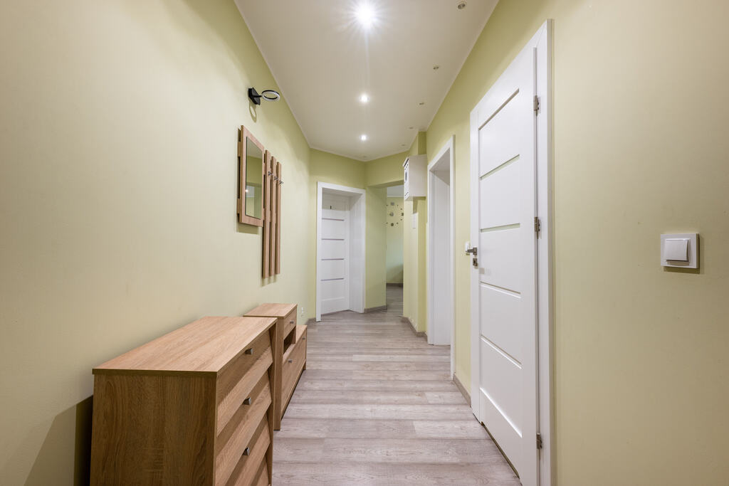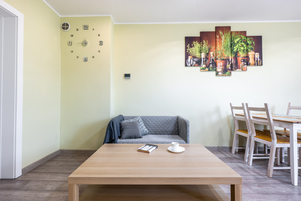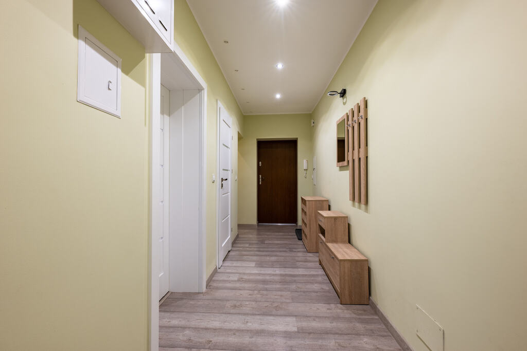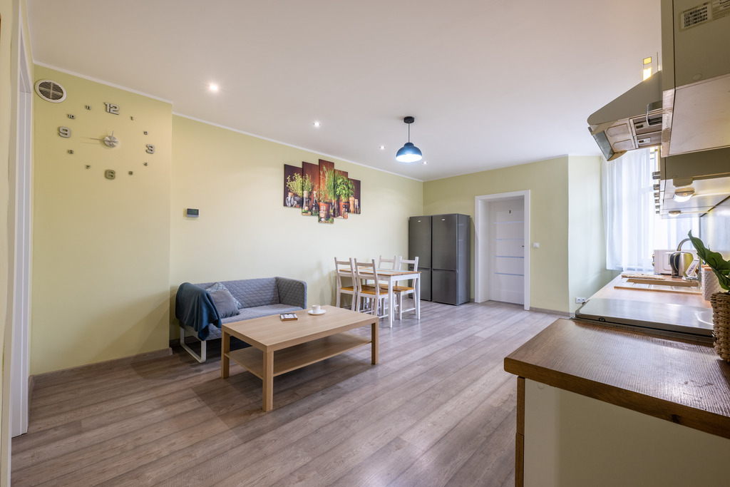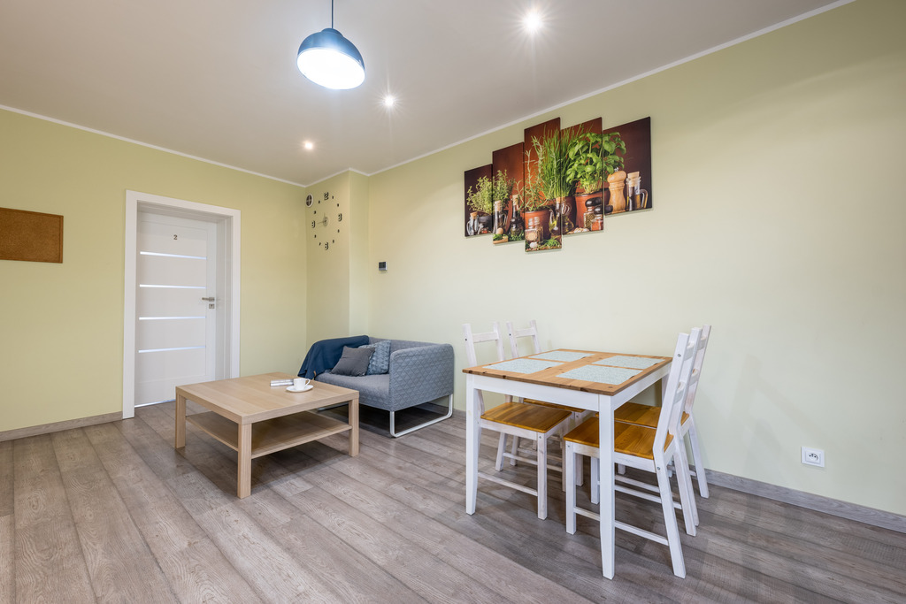 Lokator będzie miał dostęp do salonu z aneksem kuchennym, korytarza, łazienki oraz WC. W kuchni znajdziemy dwie lodówki, kuchenkę elektryczną, piekarnik, okap oraz szafki do przechowywania. W części salonowej mamy do dyspozycji stół jadalniany z 4 krzesłami oraz kanapę ze stołem kawowym. W łazience jest prysznic, umywalka i toaleta. W WC znajdziemy toaletę umywalkę oraz pralkę.
