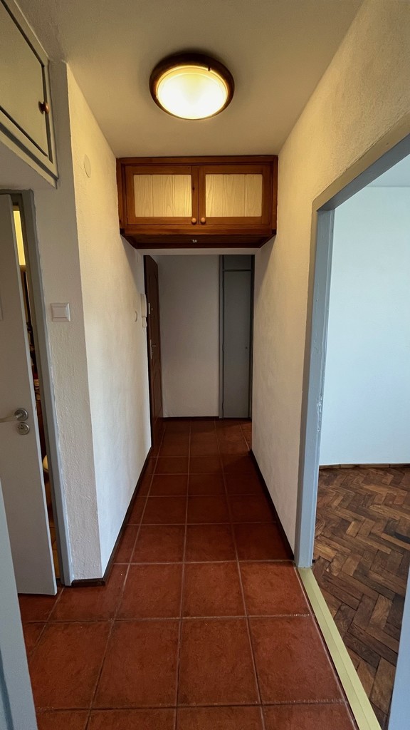 Na podłodze drewniany parkiet, panele oraz kafle, ściany gładzone malowane.
