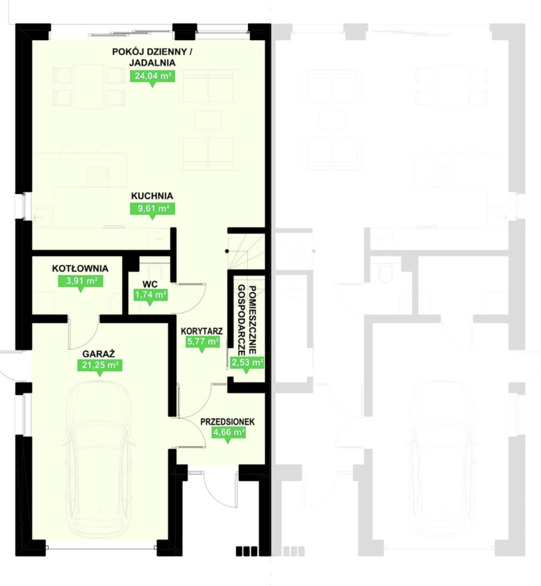 - Garaż – 21,25 m²