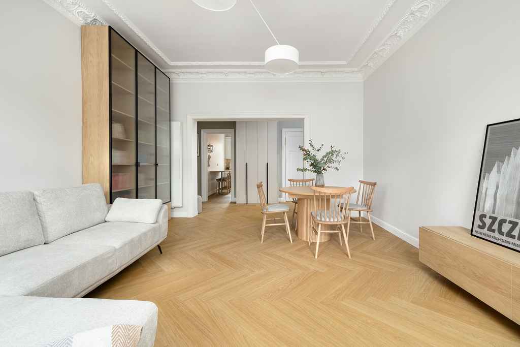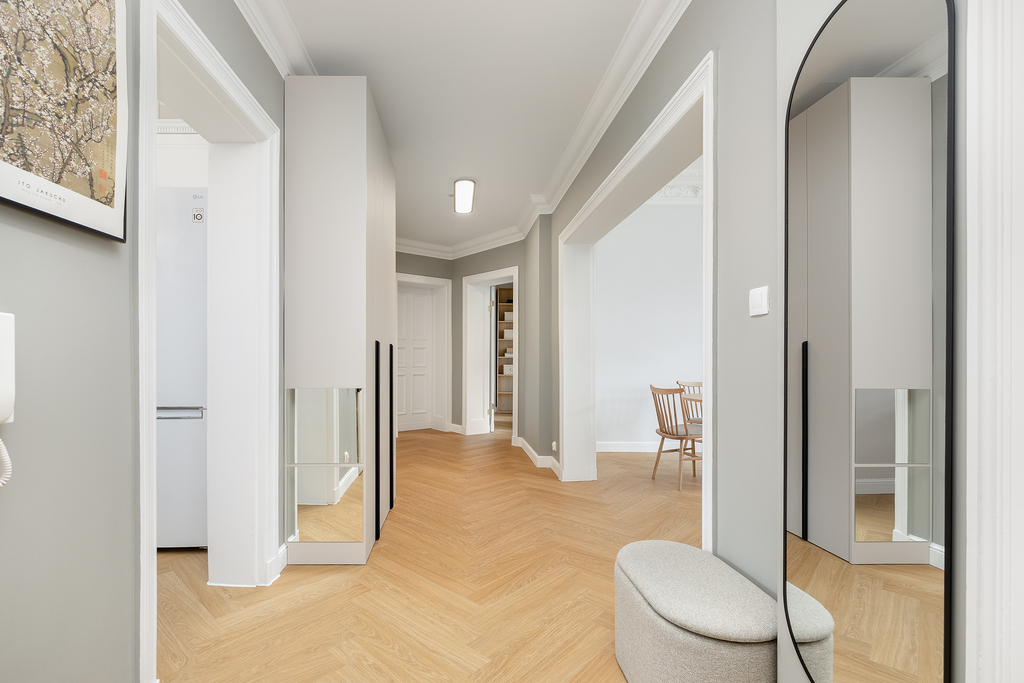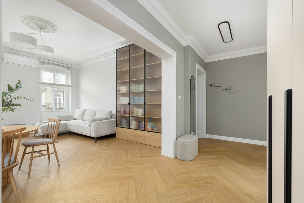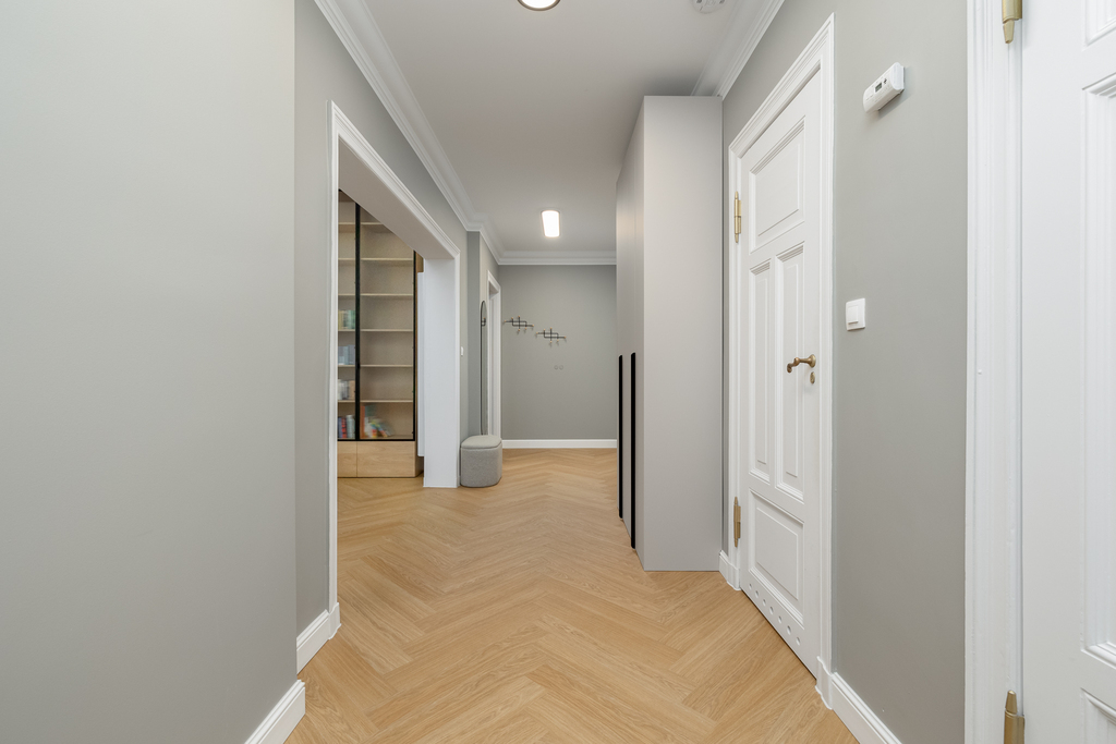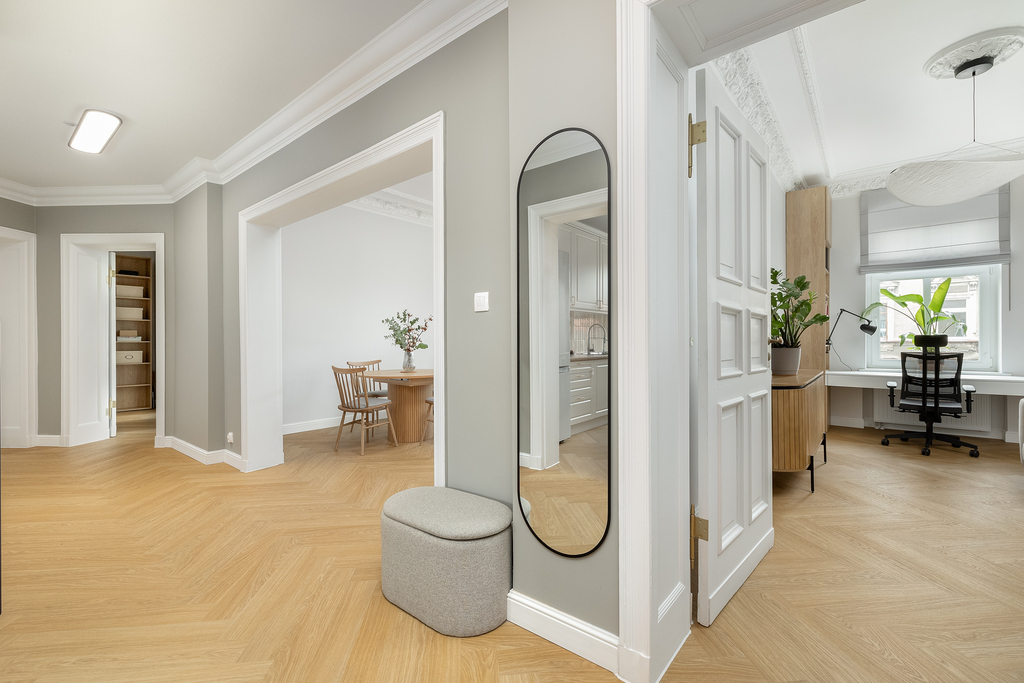 Modernizacja objęła: wymianę instalacji elektrycznej, instalacji wodno-kanalizacyjnej, wymianę okien na nowe 3-szybowe, odrestaurowanie sztukaterii w salonie oraz w jednym z pokoi. W salonie została zamontowana klimatyzacja. Wymieniono wszystkie grzejniki, schowano wszystkie rury od CO, odmalowano i odrestaurowano całą stolarkę drzwiową. W całym mieszkaniu zostały położone wysokiej jakości panele. Wymienione oświetlenie oraz zakupiono meble pod zabudowę (gabinet, salon oraz pomieszczenie gospodarcze).