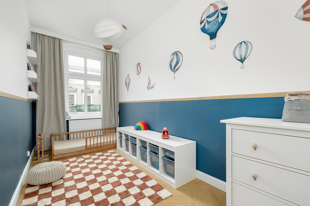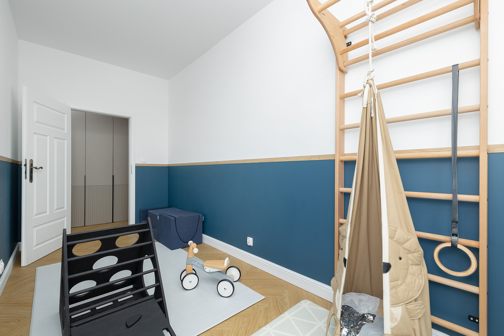- Pokój (24,64m2), który został podzielony na 2 osobne pokoje dziecięce (po 10,02m2 każdy),