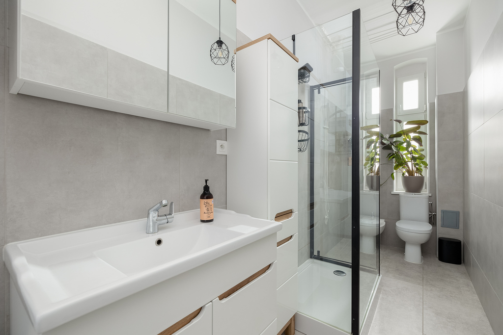 - Łazienka (6,63m2), z prysznicem WC i bidetem,