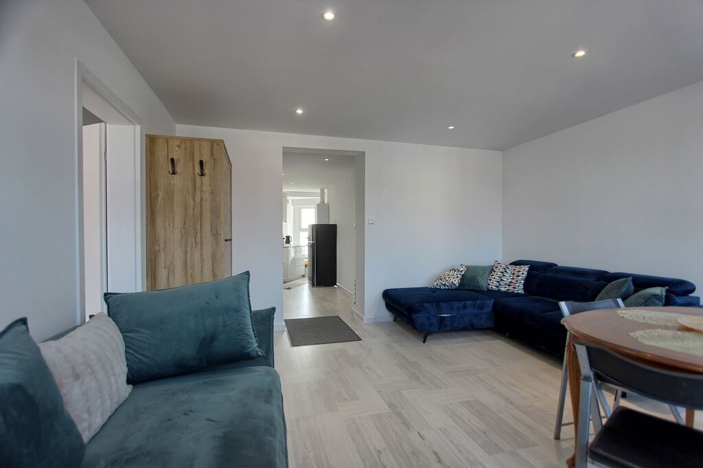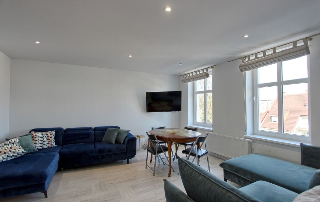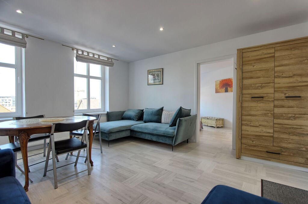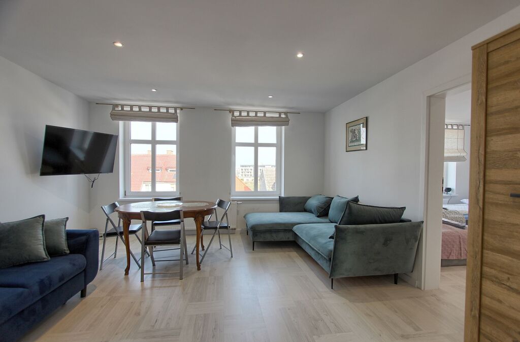 Funkcjonalny układ – przestronny salon z dużymi oknami i wygodną kanapą, sypialnia z komfortowym łóżkiem, w pełni wyposażona kuchnia oraz stylowa łazienka z kabiną prysznicową.