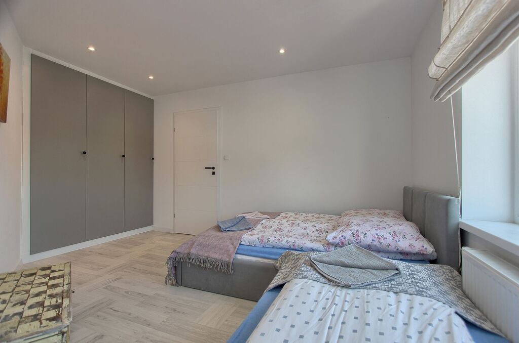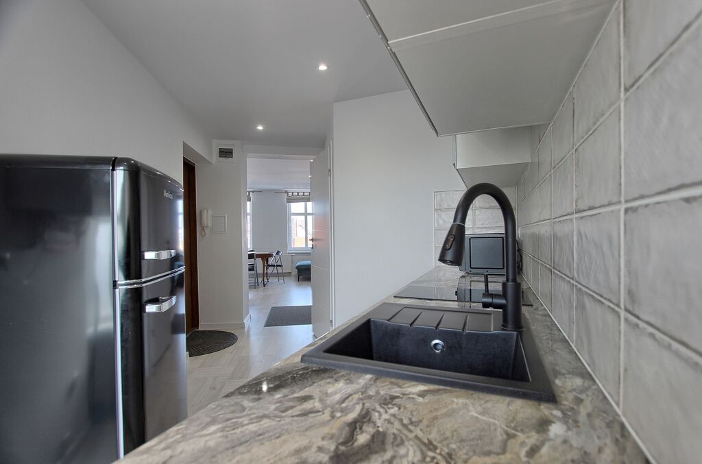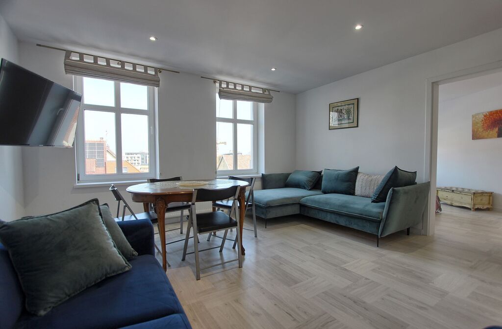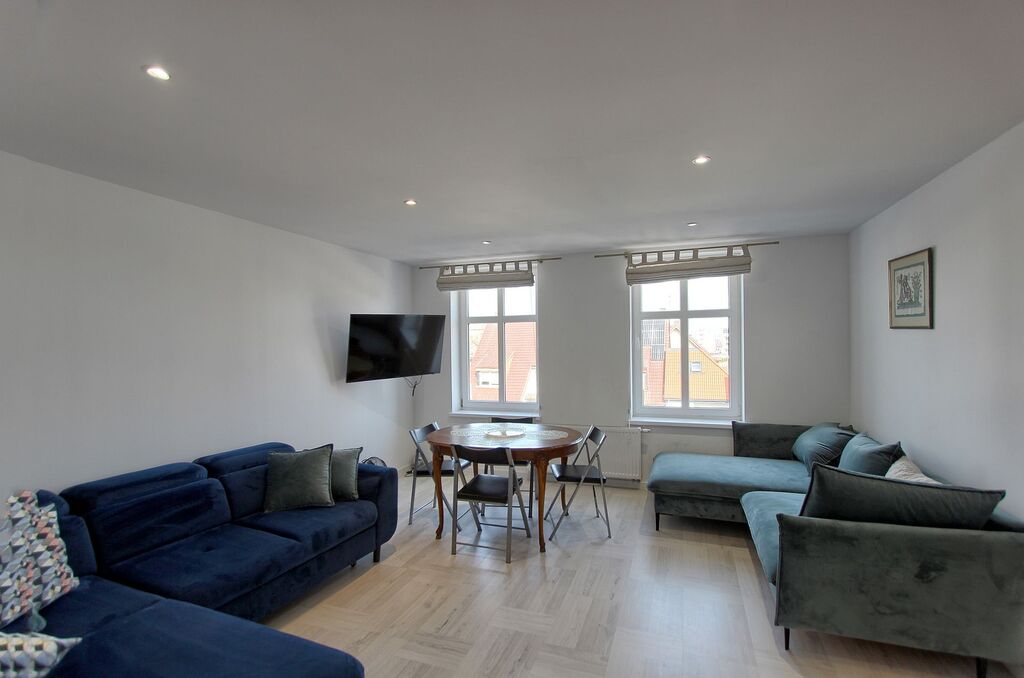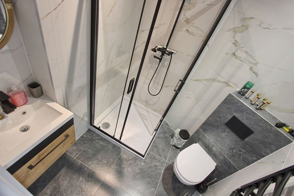 Funkcjonalny układ – przestronny salon z dużymi oknami i wygodną kanapą, sypialnia z komfortowym łóżkiem, w pełni wyposażona kuchnia oraz stylowa łazienka z kabiną prysznicową.