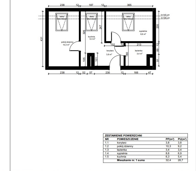 Salon 10,3m2, sypialnia 8,6m², łazienka 3,4m², kuchnia 6,3m², korytarz.