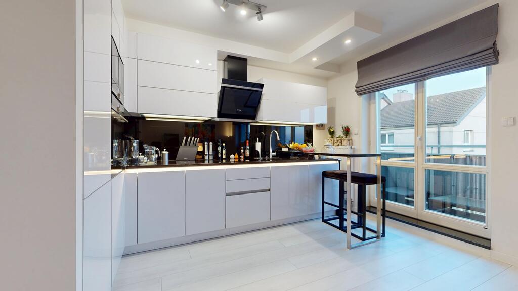 Mieszkanie zostało ciekawie zaaranżowane, wyposażone w meble i sprzęty bardzo dobrej jakości. Kuchnia niemieckiej firmy zrobiona na zamówienie, o wartości 50.000 zł (jest to koszt samych mebli).