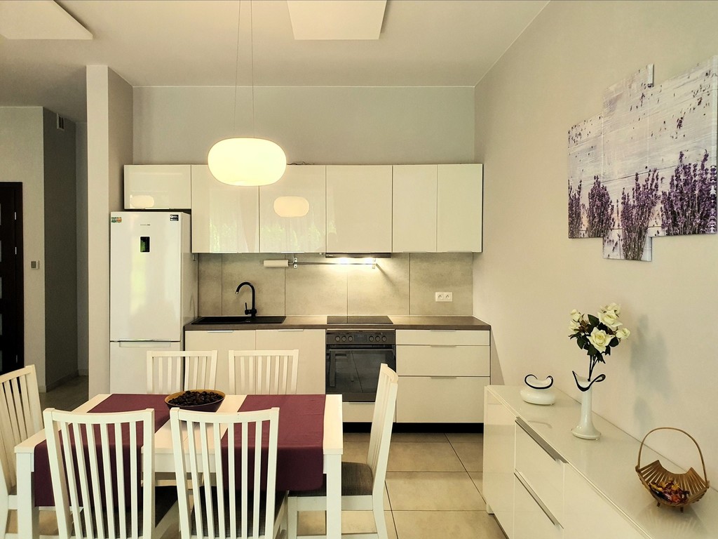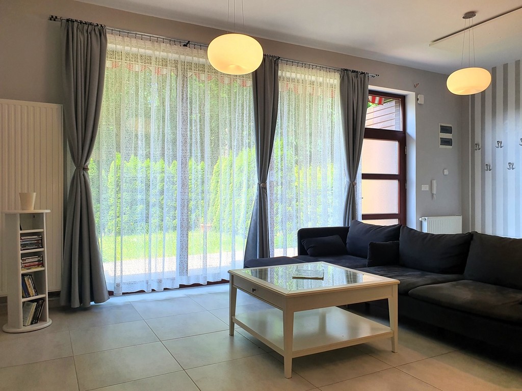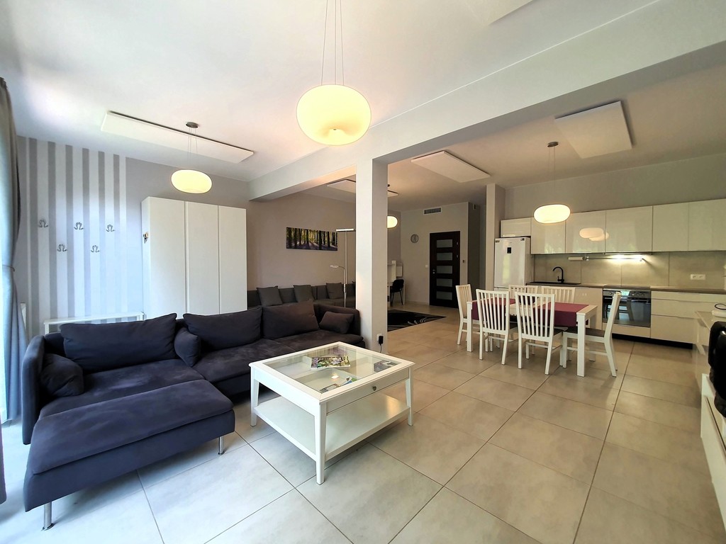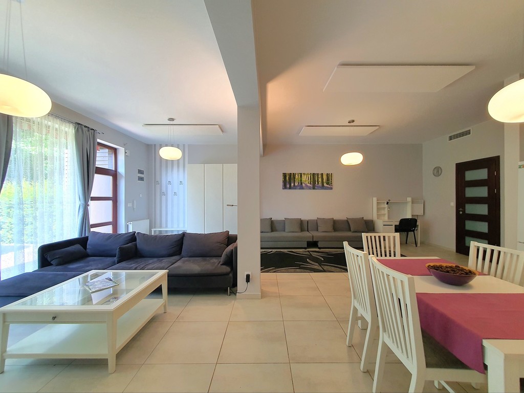 - bardzo przestronny umeblowany salon z częścią jadalną oraz aneksem kuchennym z oknami od strony zachodniej