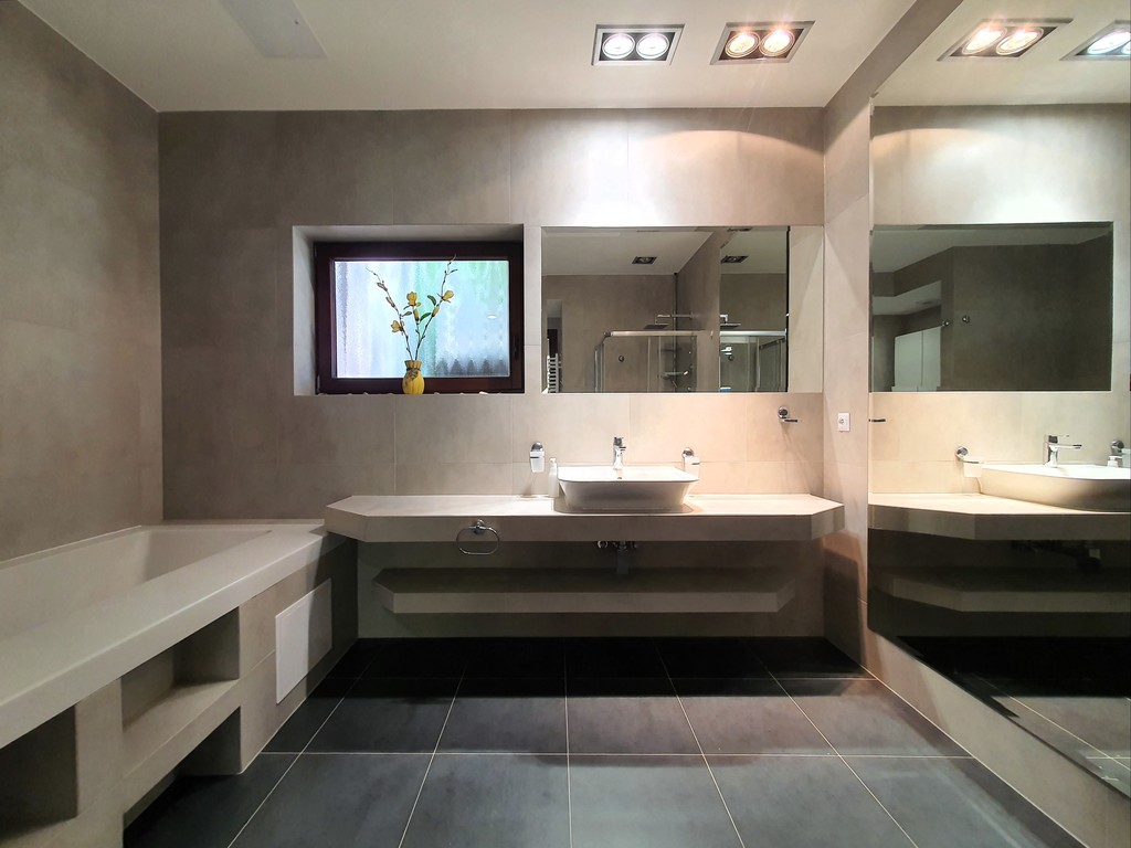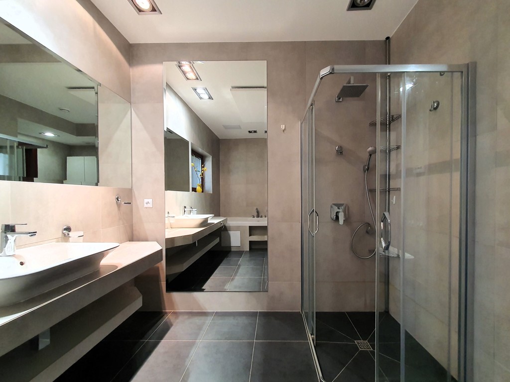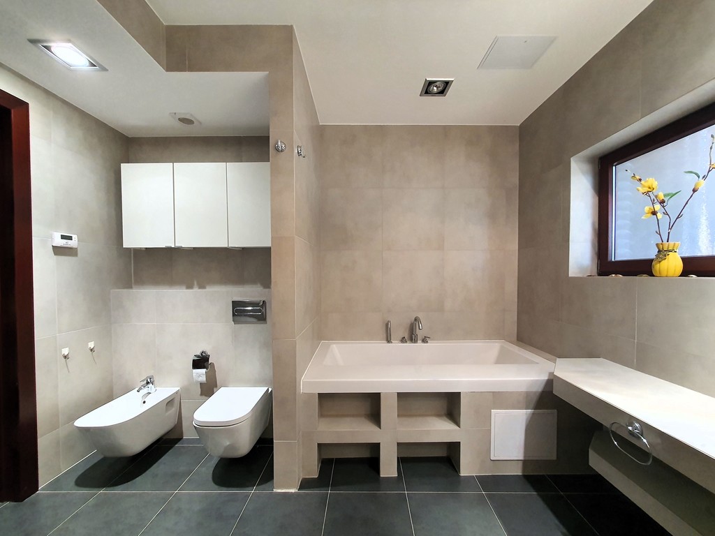 - duża łazienka z wanną, prysznicem, wc, bidetem oraz umywalką