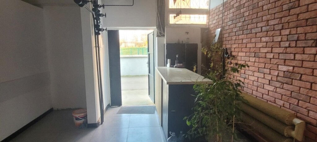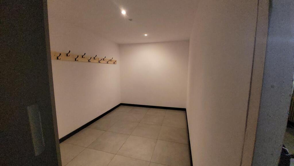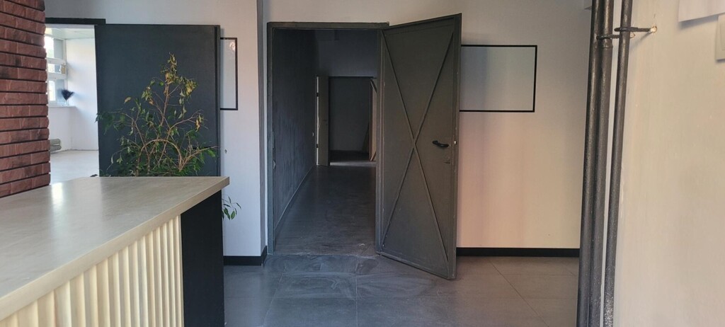 Wysokość lokalu ok. 4 m. Na podłodze panele oraz częściowo płytki. Ściany malowane w jasnych kolorach, na jednej ze ścian wygłuszanie oraz tapeta imitująca lamele ścienne.