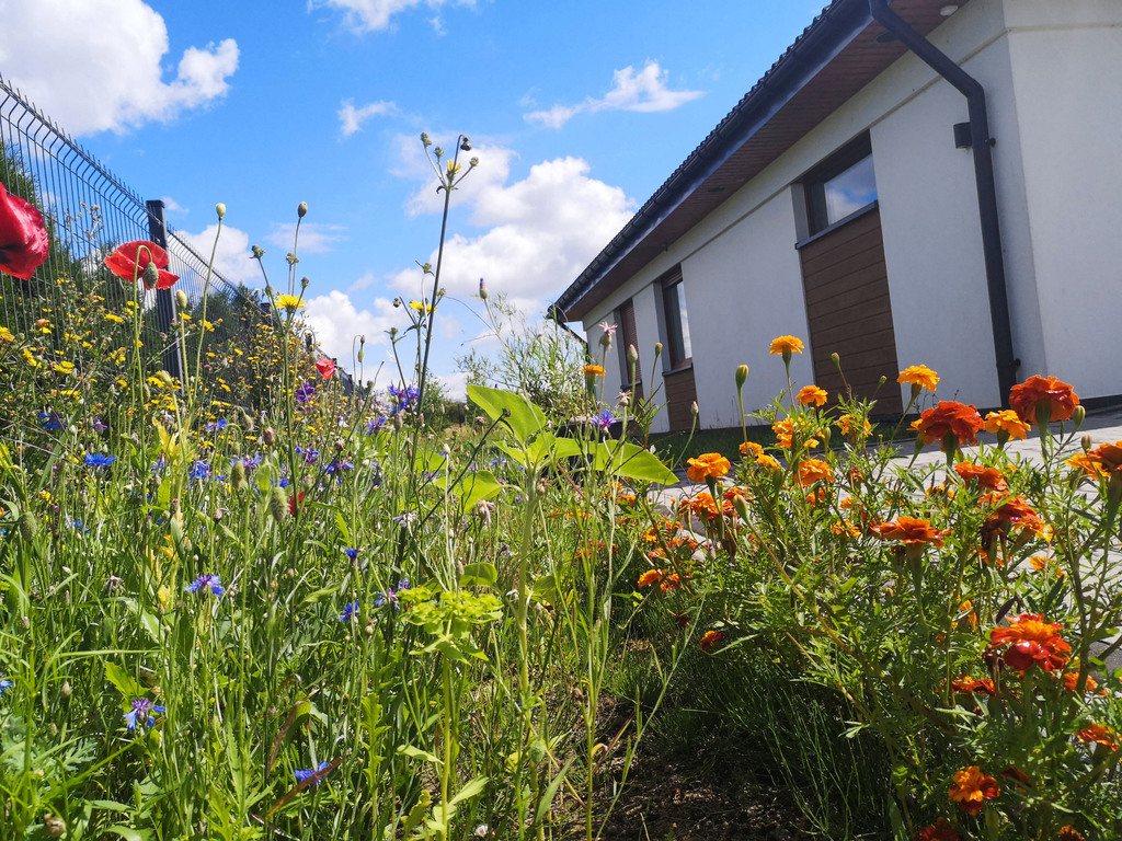 - od frontu i z tyłu domu łąka, dzika przyroda i zwierzyna,