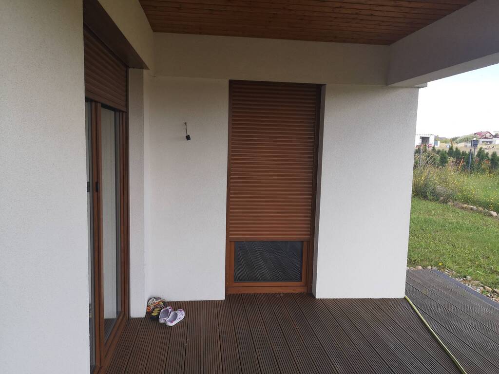 Podjazd do domu wyłożony kostką. Wszystkie okna zabezpieczone automatycznymi roletami antywłamaniowymi.
