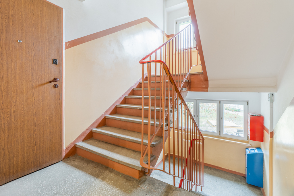 Mieszkanie o powierzchni 24,2 m² znajduje się na pierwszym piętrze niskiego bloku i składa się z: