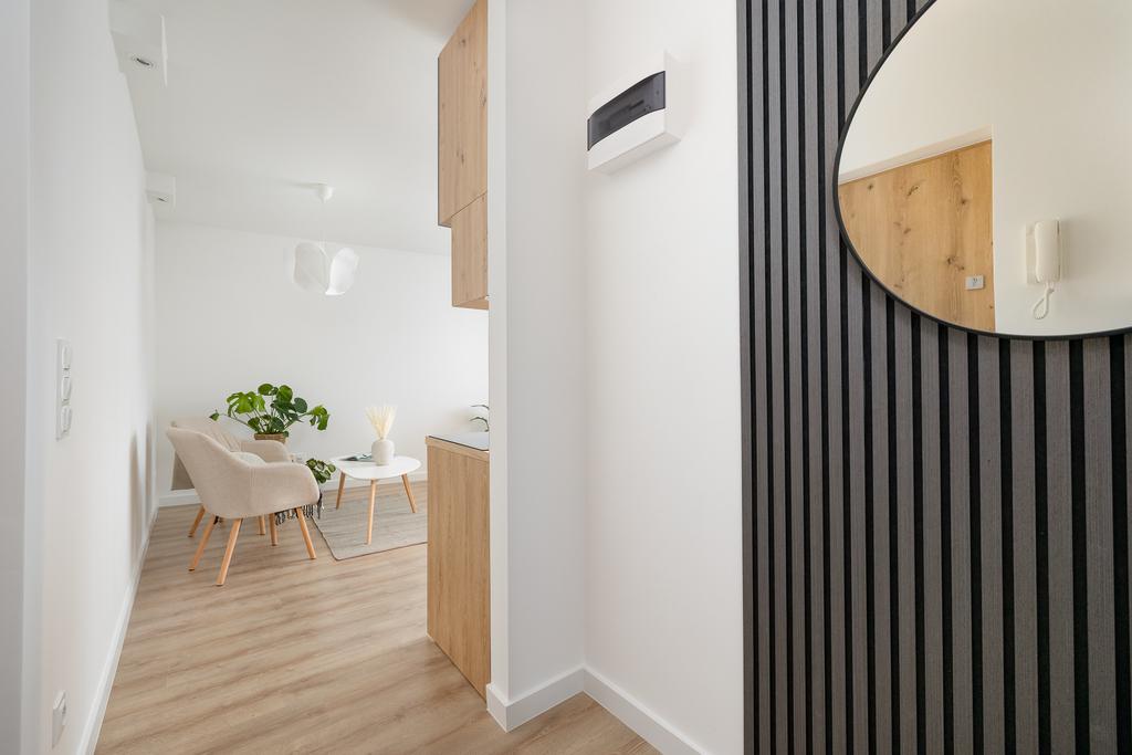 Mieszkanie po remoncie w wyniku, którego wyodrębniono sypialnię i pokój z aneksem kuchennym. Łazienka z nowoczesnym designe.