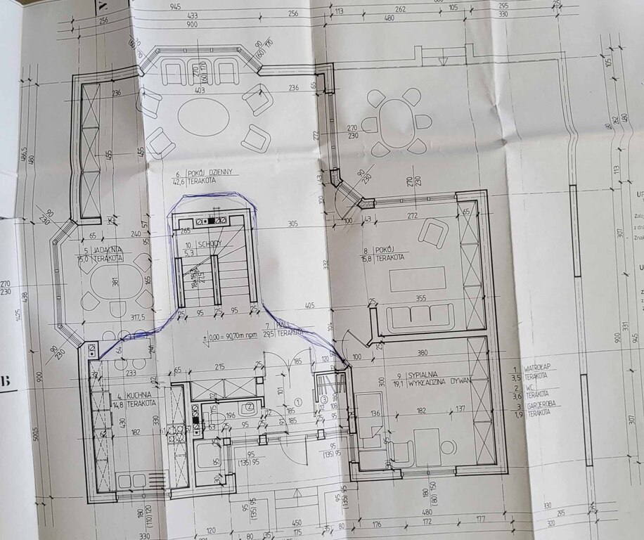 - przestronny salon z kominkiem i z wyjściem na taras i dalej ogród,