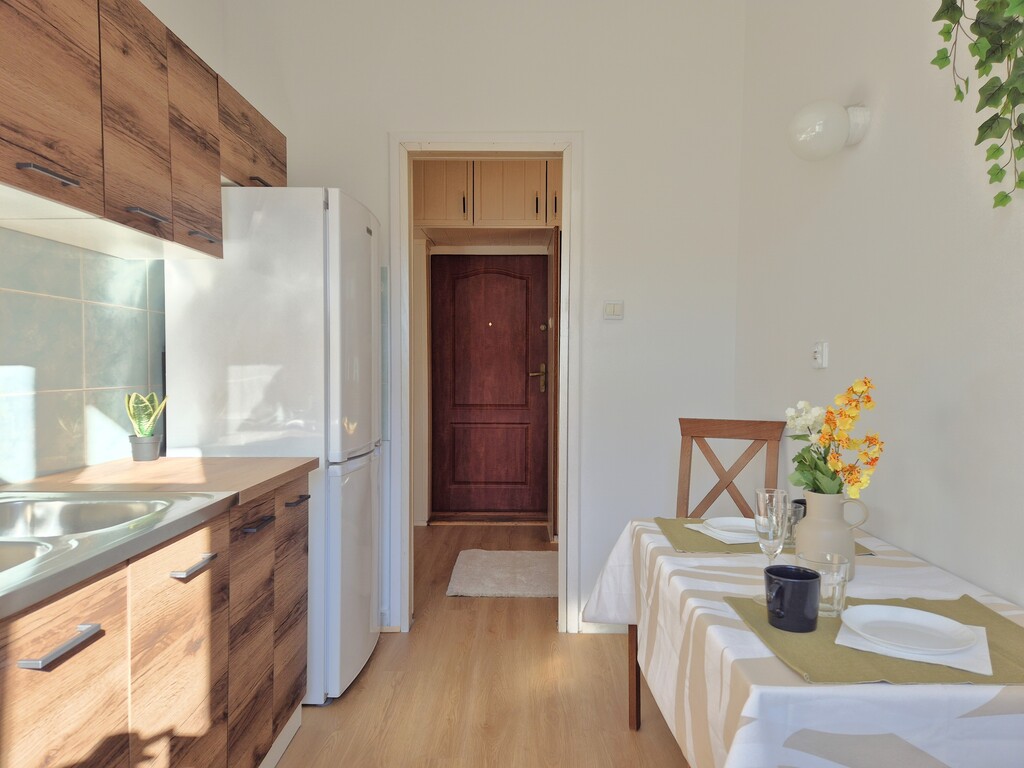* widna kuchnia, w której znalazło się miejsce na stół z krzesłami, wyposażona w nowe meble kuchenne, kuchenkę elektryczną i lodówkę